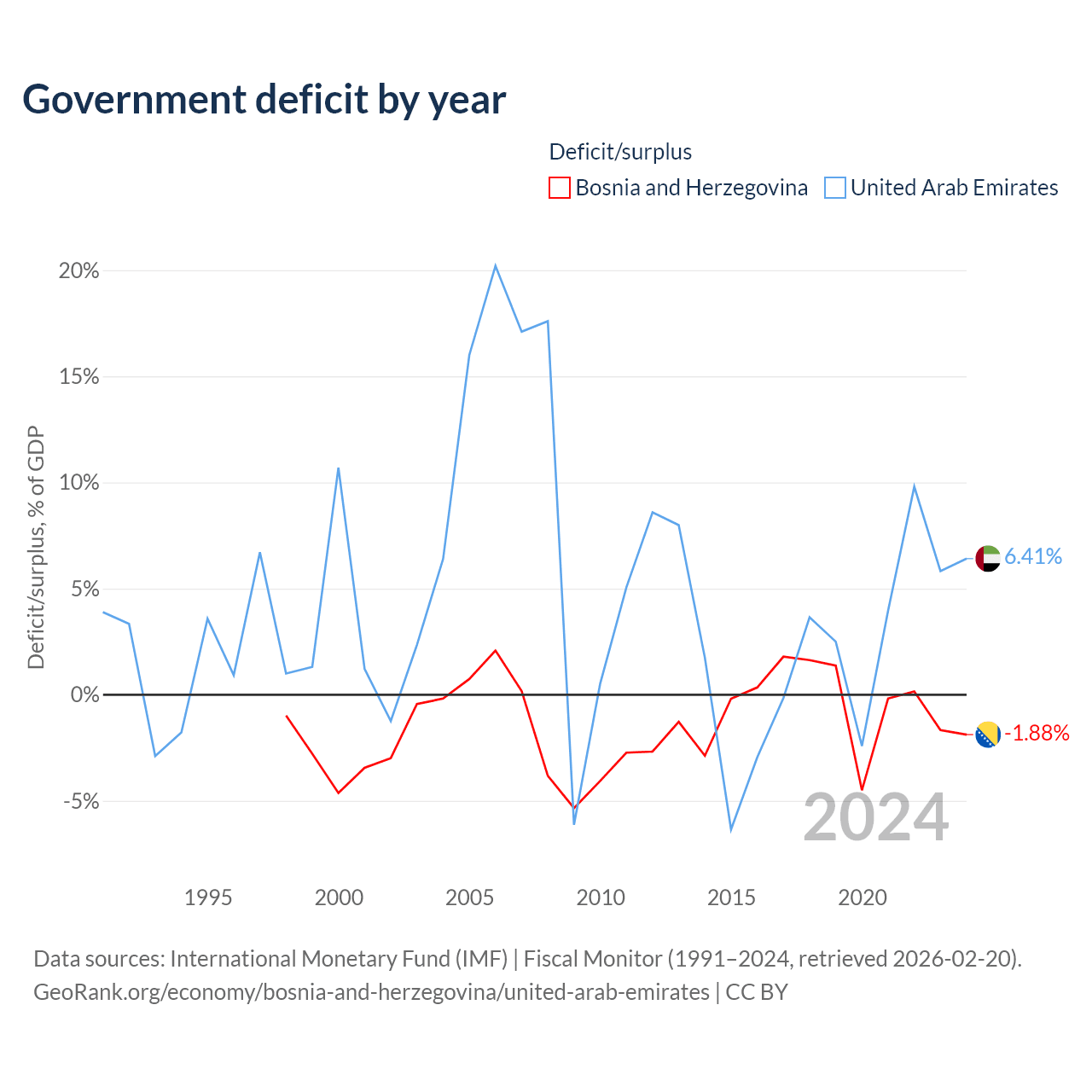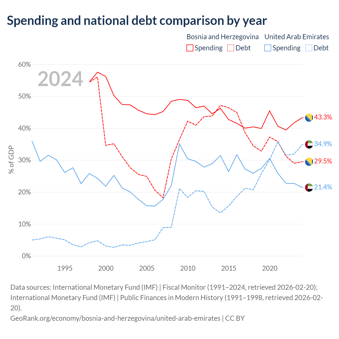Bosnia and Herzegovina has $8.74B in government debt (29.5% of GDP), compared to $193B (34.9% of GDP) in the United Arab Emirates.