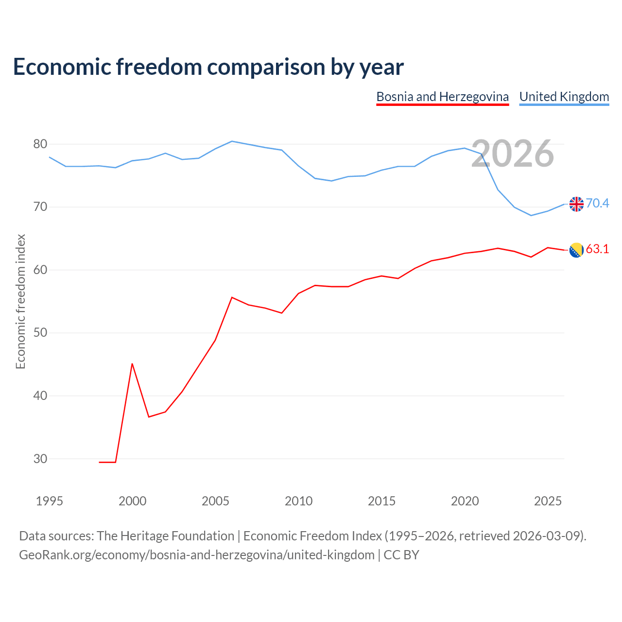 The Economic Freedom Index for Bosnia and Herzegovina is 63.1, ranking 83/197, compared to 70.4 for the United Kingdom, ranking 35/197. The chart above displays a comparison of annual changes in economic freedom indexes.