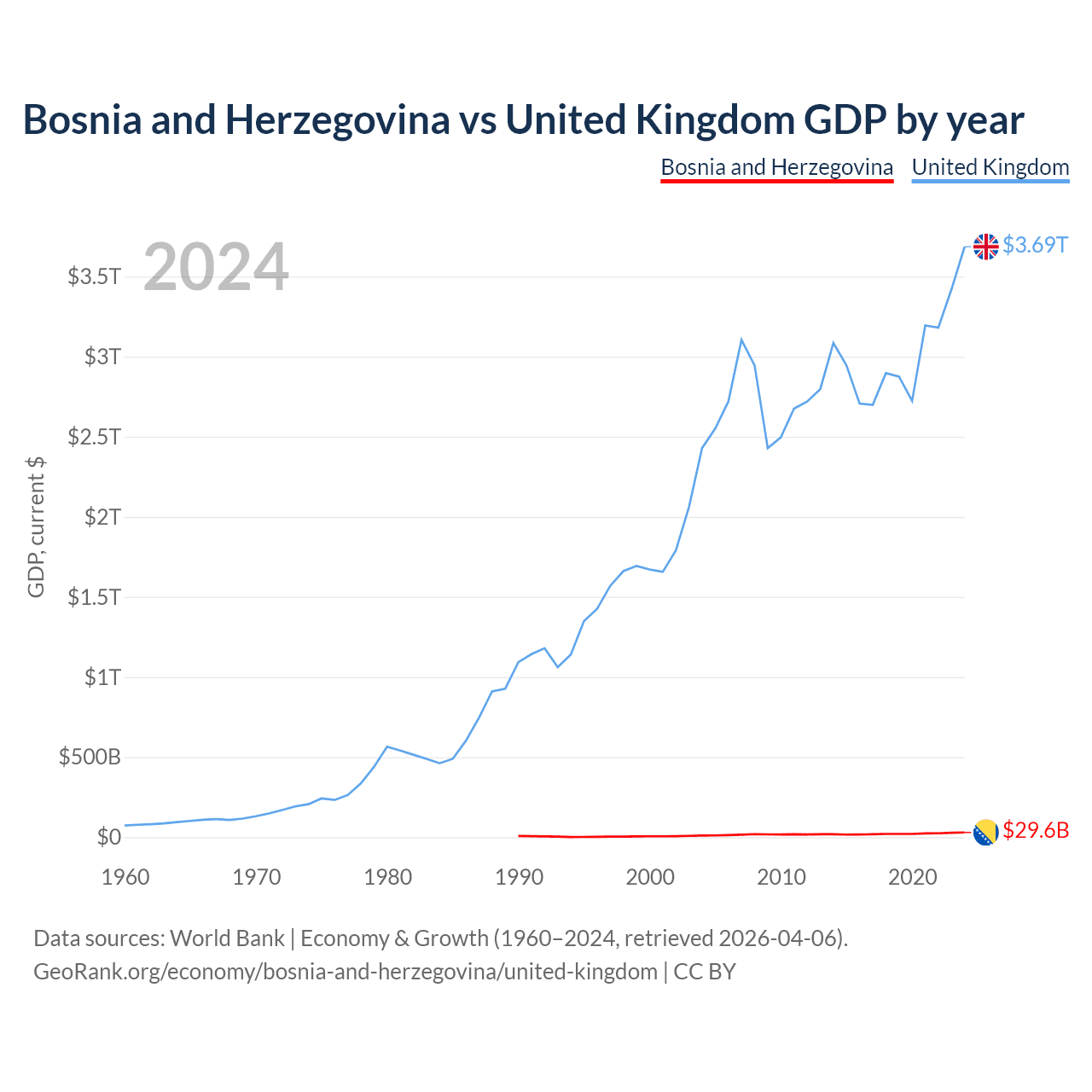 Bosnia and Herzegovina has a GDP of $29.6B compared to $3.69T for the United Kingdom, ranking 111/197 and 6/197 by economy size, respectively.