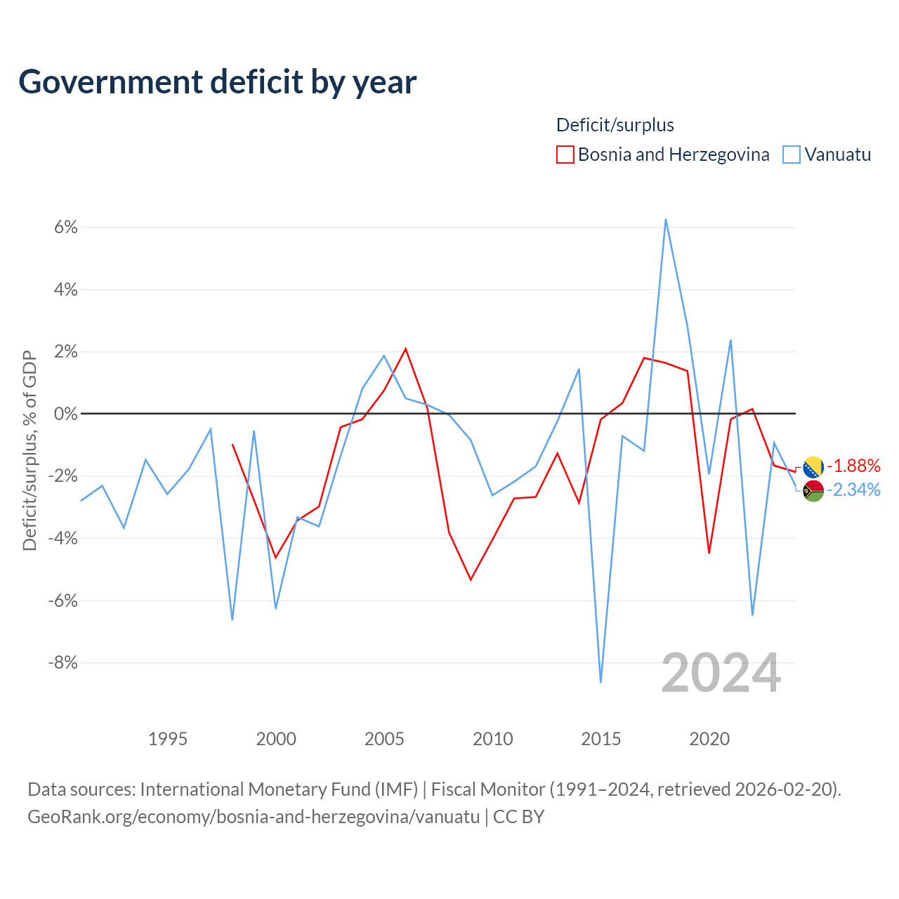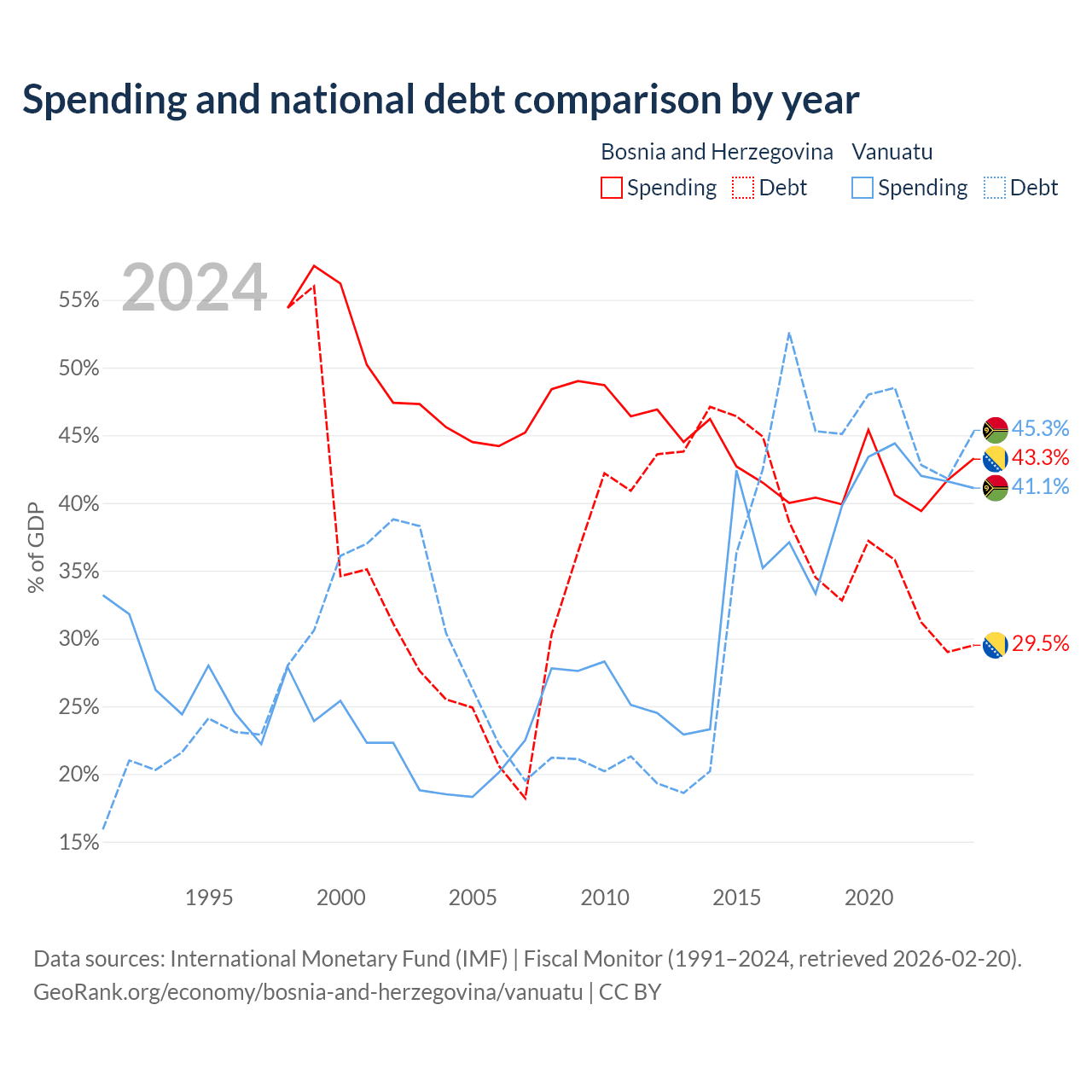 Bosnia and Herzegovina has $8.74B in government debt (29.5% of GDP), compared to $507M (45.3% of GDP) in Vanuatu.