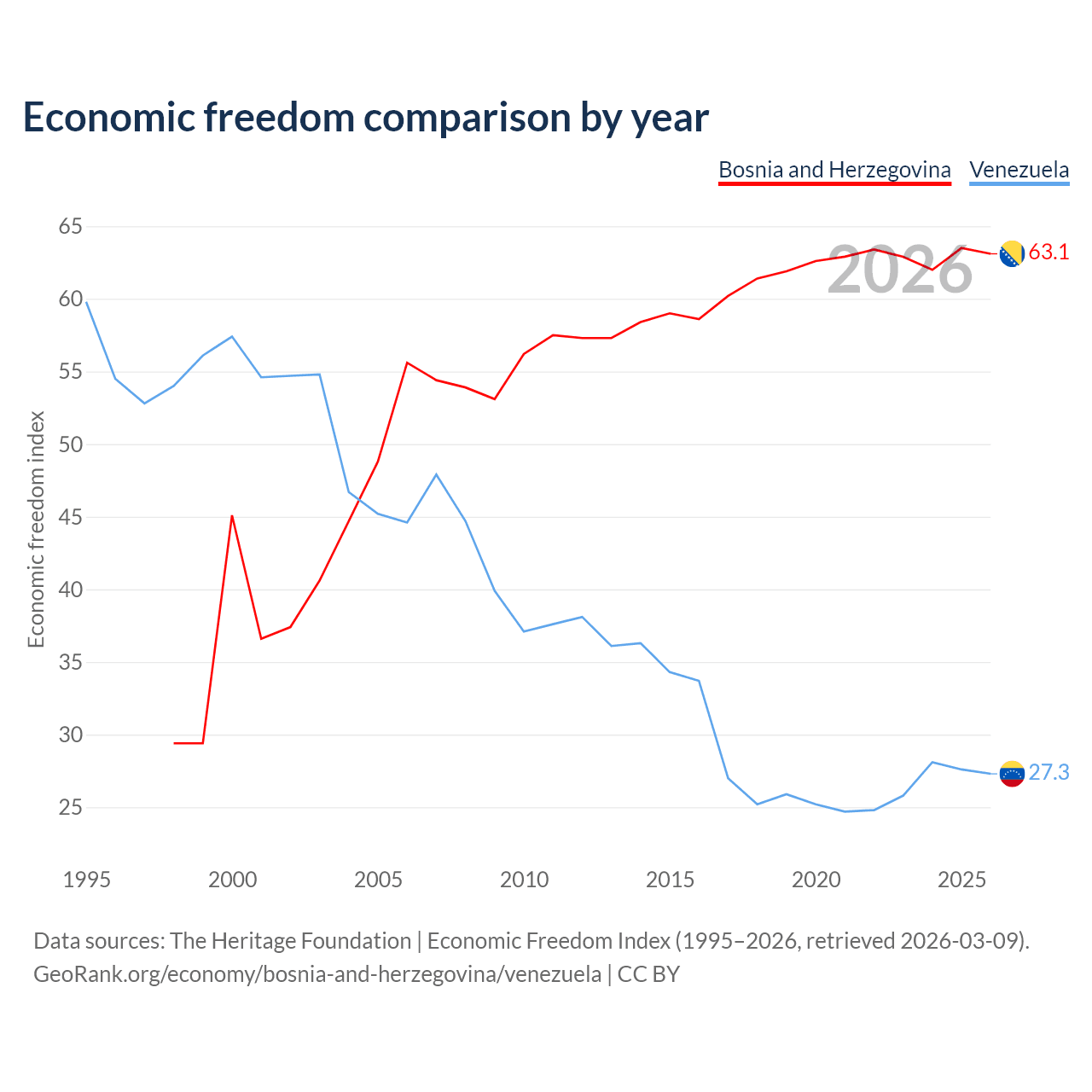 The Economic Freedom Index for Bosnia and Herzegovina is 63.1, ranking 83/197, compared to 27.3 for Venezuela, ranking 194/197. The chart above displays a comparison of annual changes in economic freedom indexes.