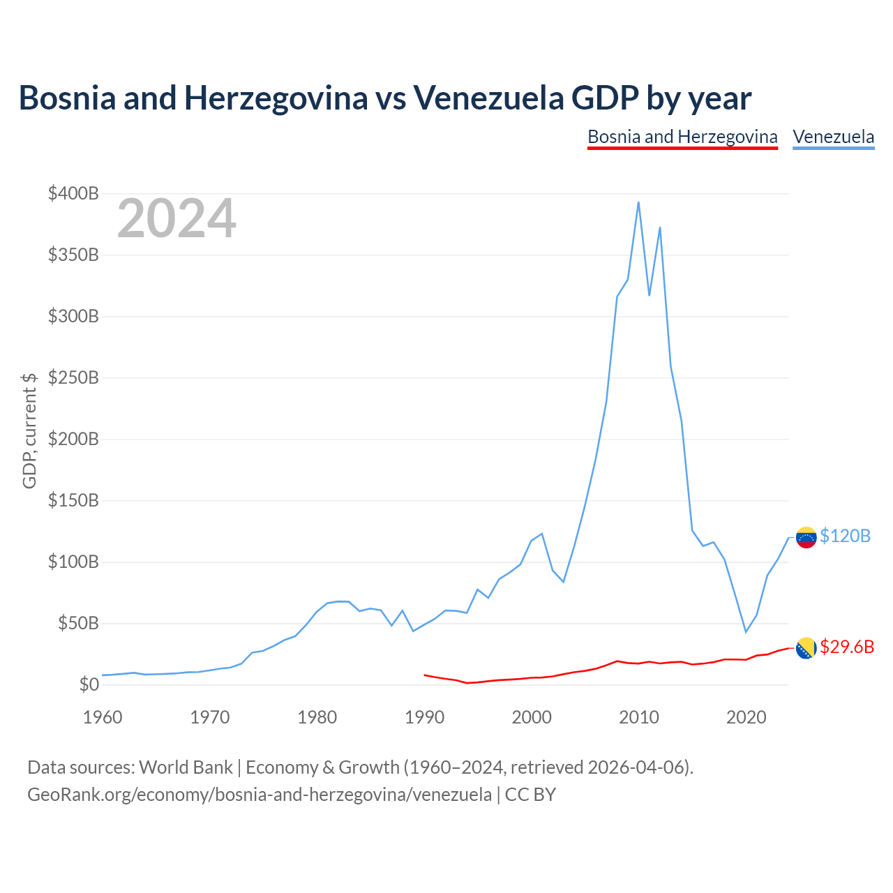 Bosnia and Herzegovina has a GDP of $29.6B compared to $120B for Venezuela, ranking 111/197 and 65/197 by economy size, respectively.