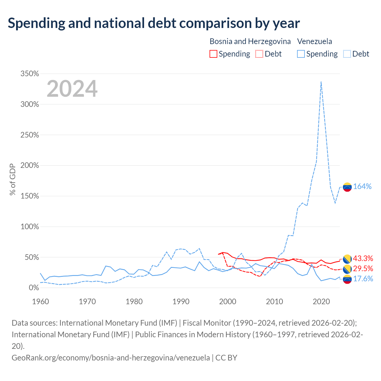 Bosnia and Herzegovina has $8.74B in government debt (29.5% of GDP), compared to $197B (164.3% of GDP) in Venezuela.