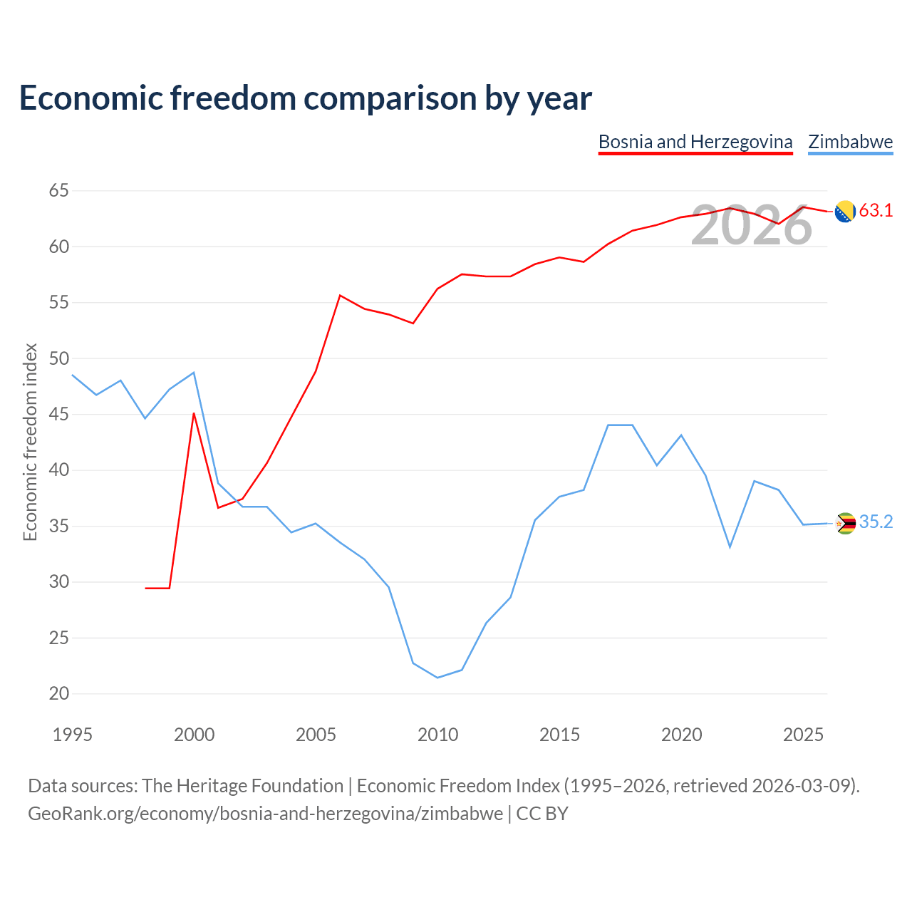 The Economic Freedom Index for Bosnia and Herzegovina is 63.1, ranking 83/197, compared to 35.2 for Zimbabwe, ranking 190/197. The chart above displays a comparison of annual changes in economic freedom indexes.