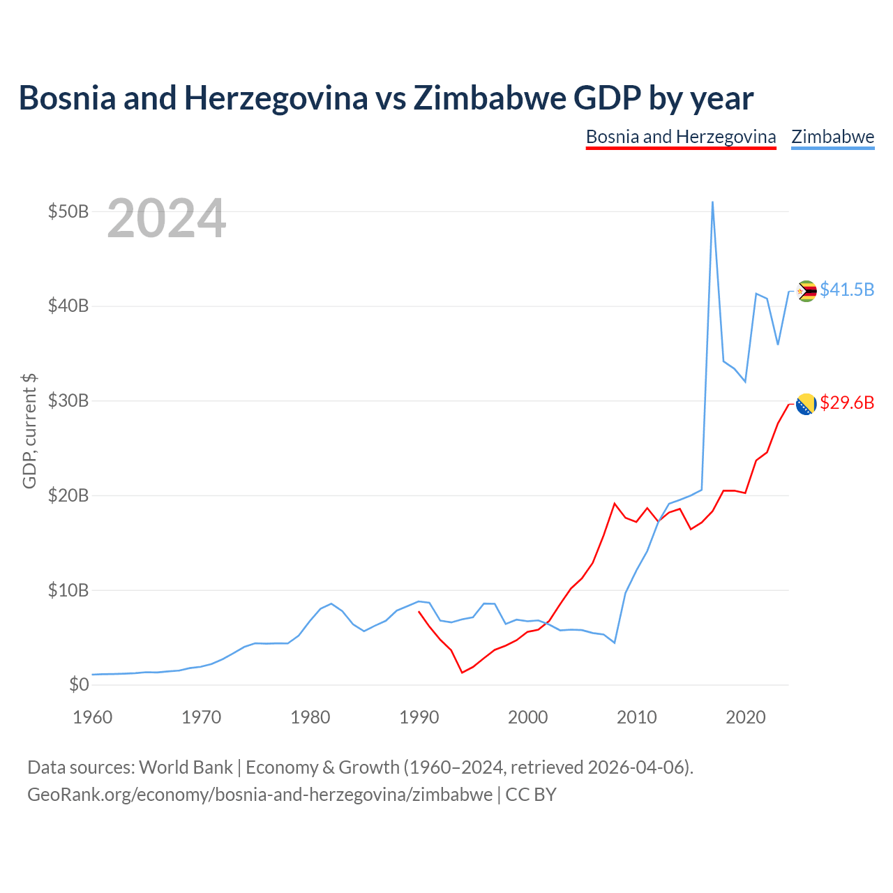 Bosnia and Herzegovina has a GDP of $29.6B compared to $41.5B for Zimbabwe, ranking 111/197 and 102/197 by economy size, respectively.