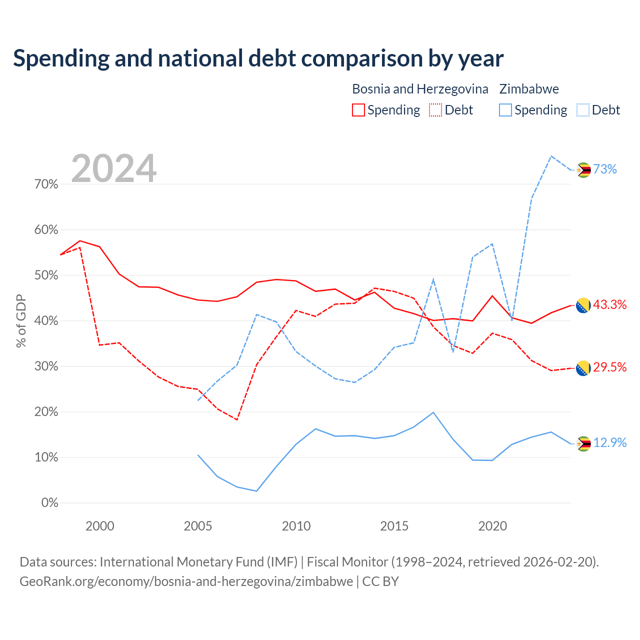 Bosnia and Herzegovina has $8.74B in government debt (29.5% of GDP), compared to $30.3B (73% of GDP) in Zimbabwe.