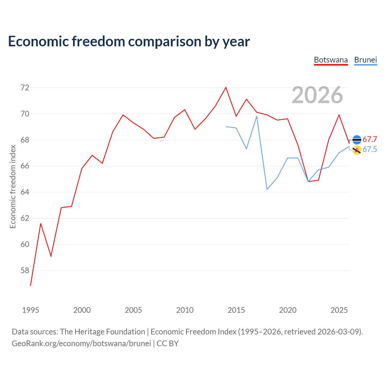 The Economic Freedom Index for Botswana is 67.7, ranking 53/197, compared to 67.5 for Brunei, ranking 55/197. The chart above displays a comparison of annual changes in economic freedom indexes.