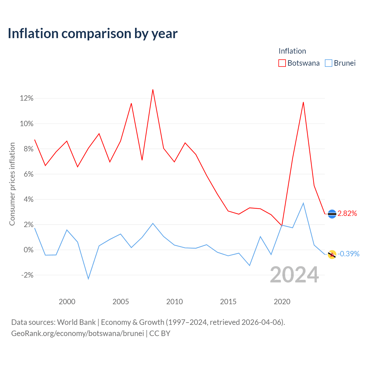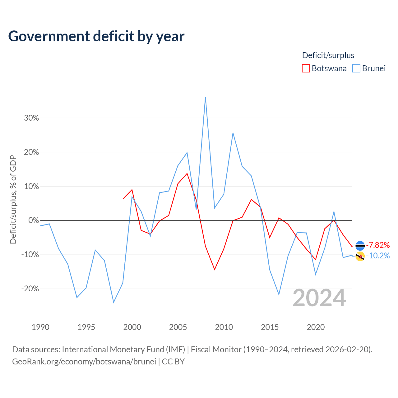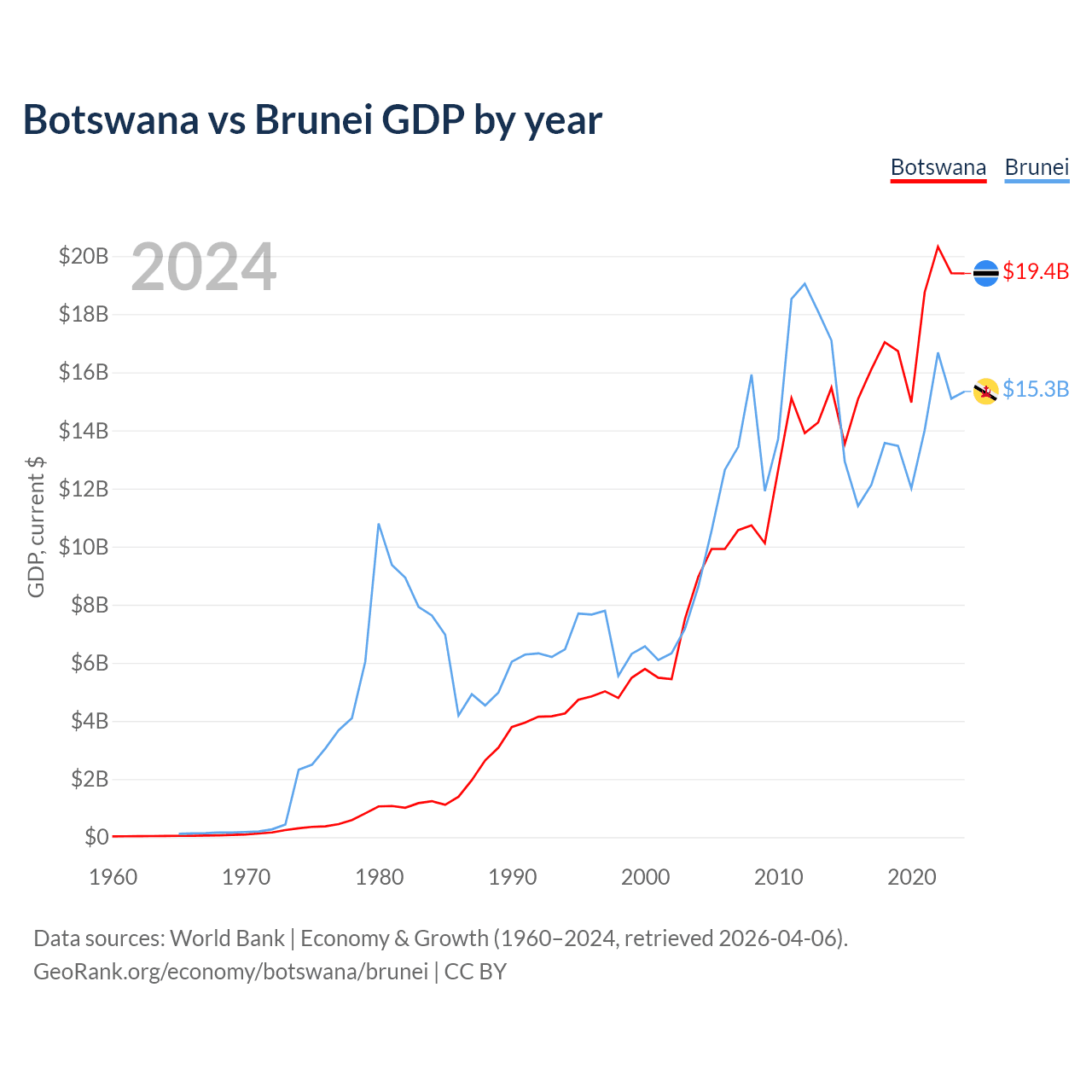 Botswana has a GDP of $19.4B compared to $15.3B for Brunei, ranking 133/197 and 142/197 by economy size, respectively.