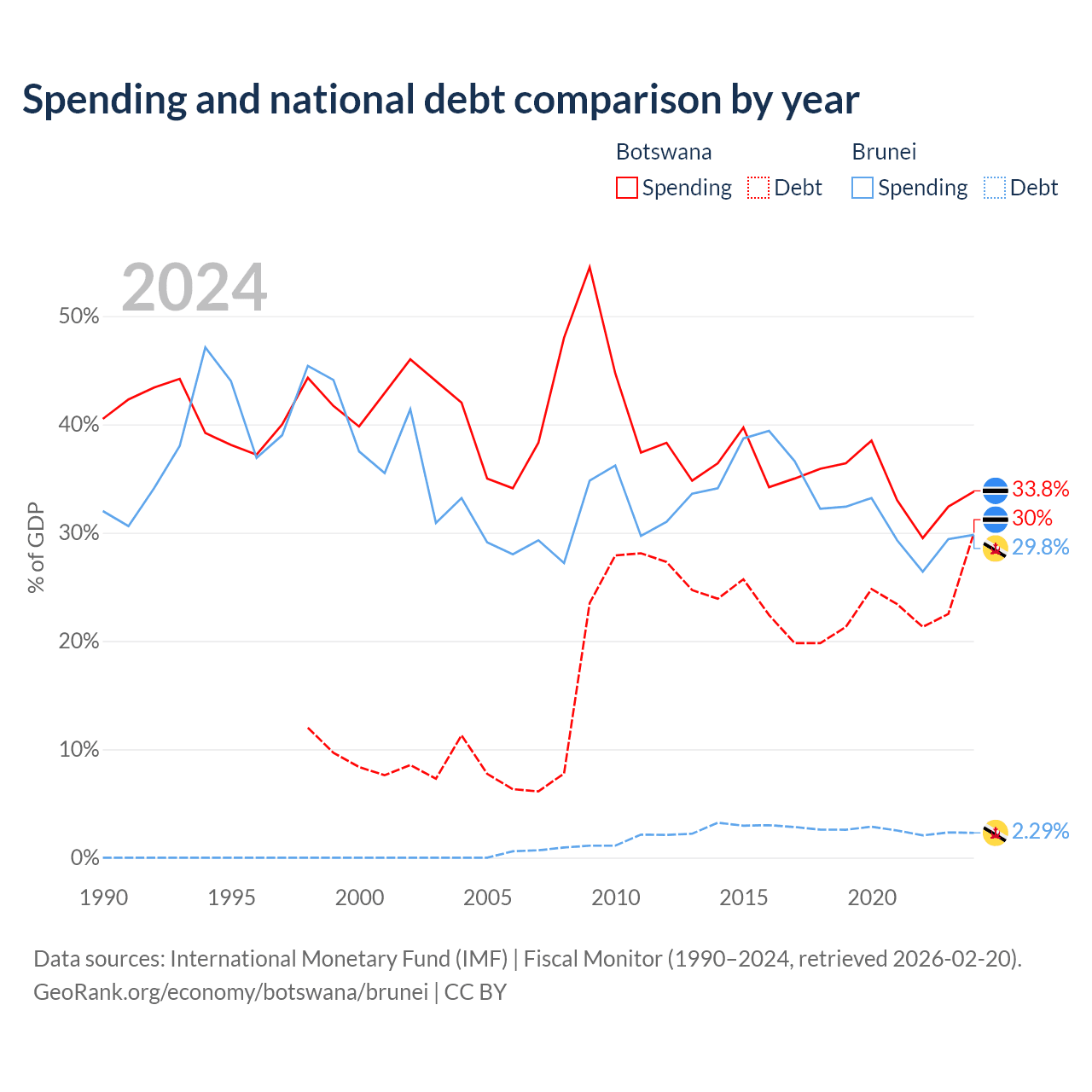 Botswana has $5.82B in government debt (30% of GDP), compared to $351M (2.29% of GDP) in Brunei.