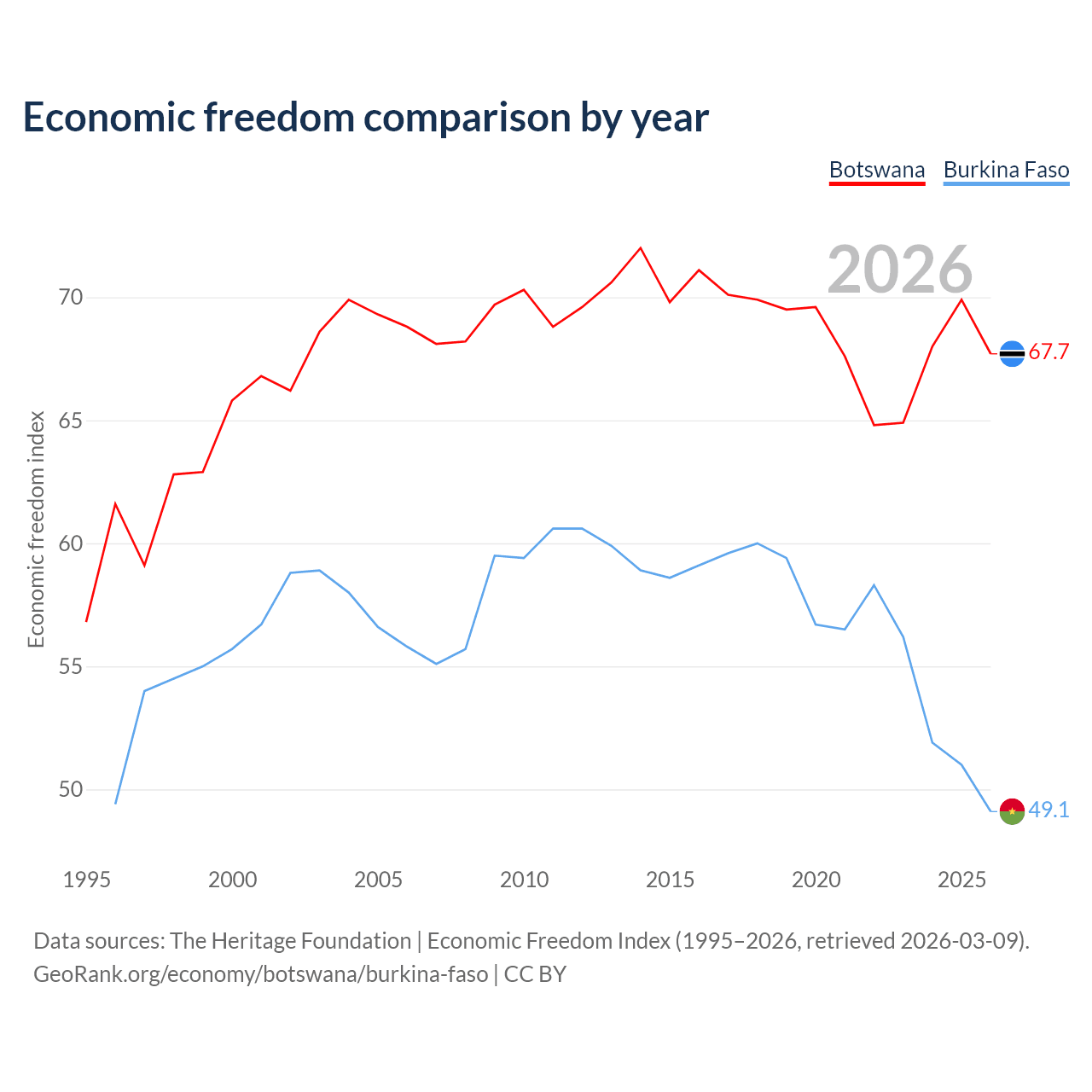 The Economic Freedom Index for Botswana is 67.7, ranking 53/197, compared to 49.1 for Burkina Faso, ranking 167/197. The chart above displays a comparison of annual changes in economic freedom indexes.