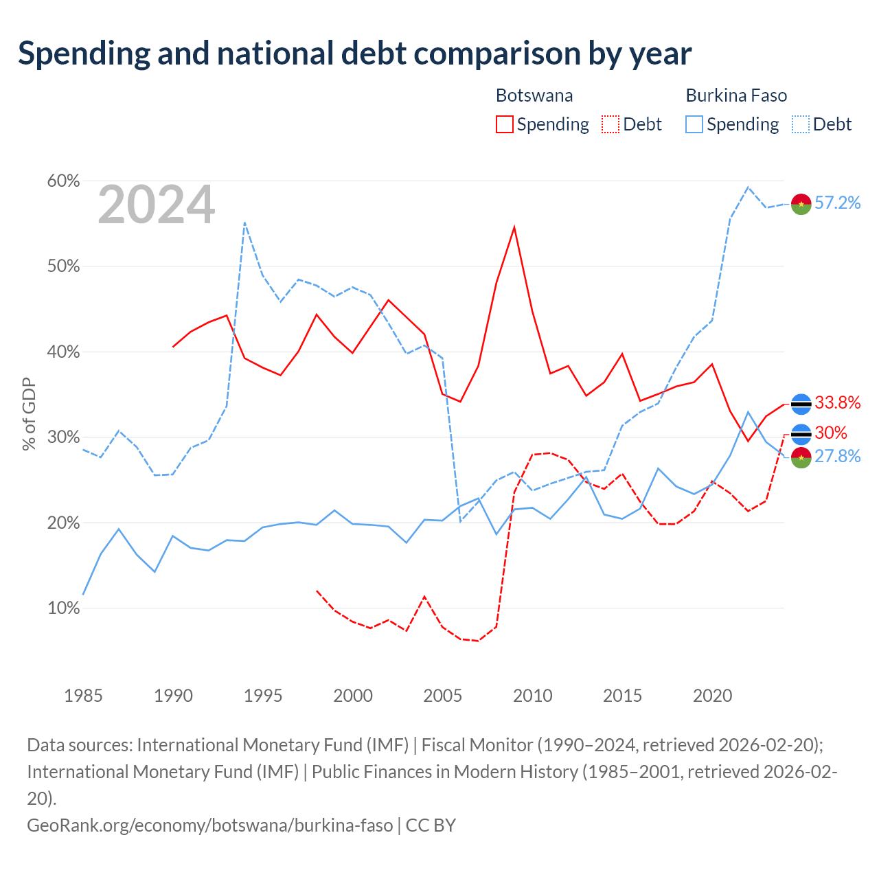 Botswana has $5.82B in government debt (30% of GDP), compared to $13.2B (57.2% of GDP) in Burkina Faso.