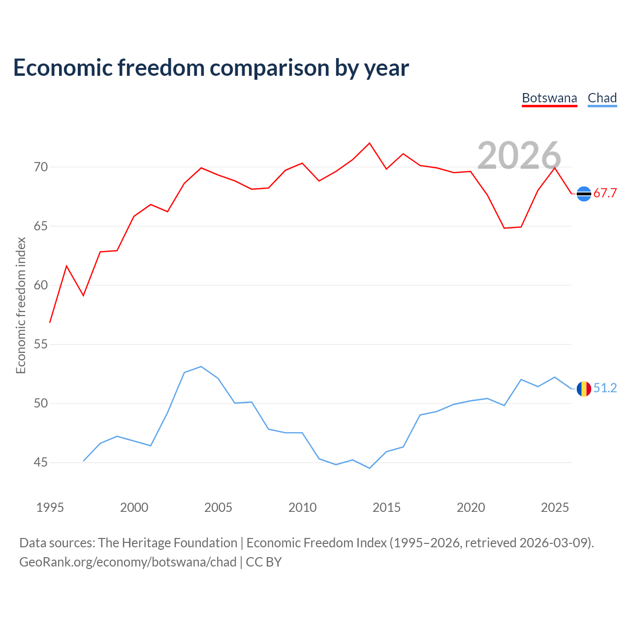 The Economic Freedom Index for Botswana is 67.7, ranking 53/197, compared to 51.2 for Chad, ranking 154/197. The chart above displays a comparison of annual changes in economic freedom indexes.