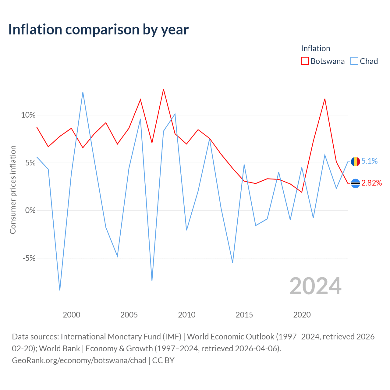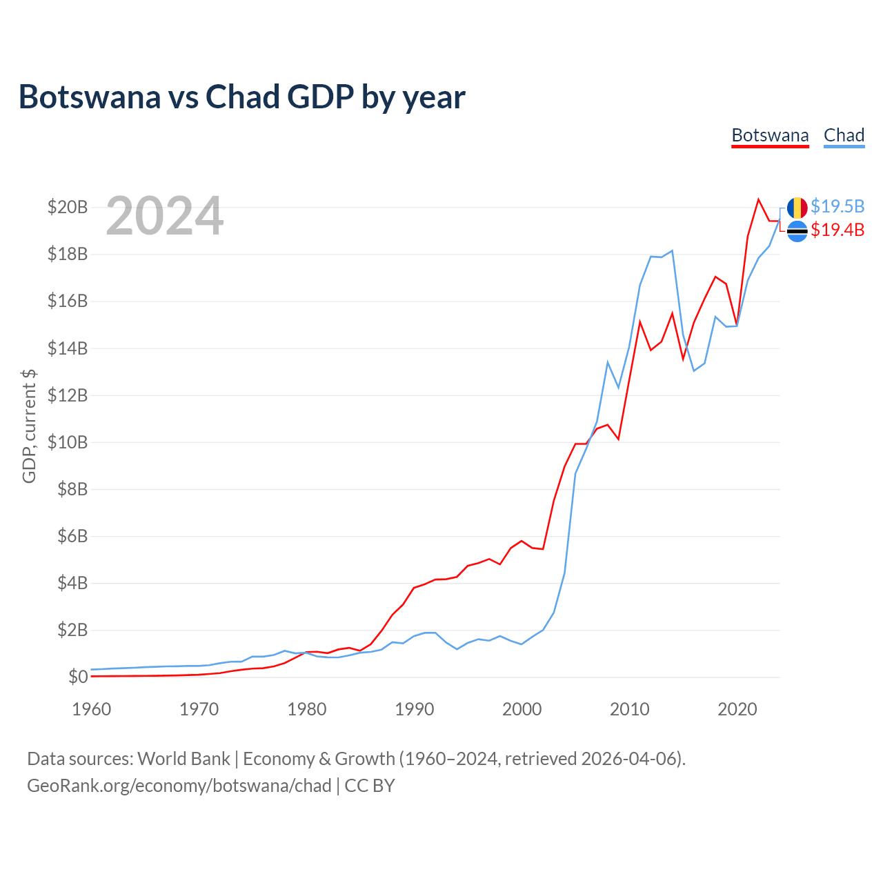 Botswana has a GDP of $19.4B compared to $19.5B for Chad, ranking 133/197 and 132/197 by economy size, respectively.