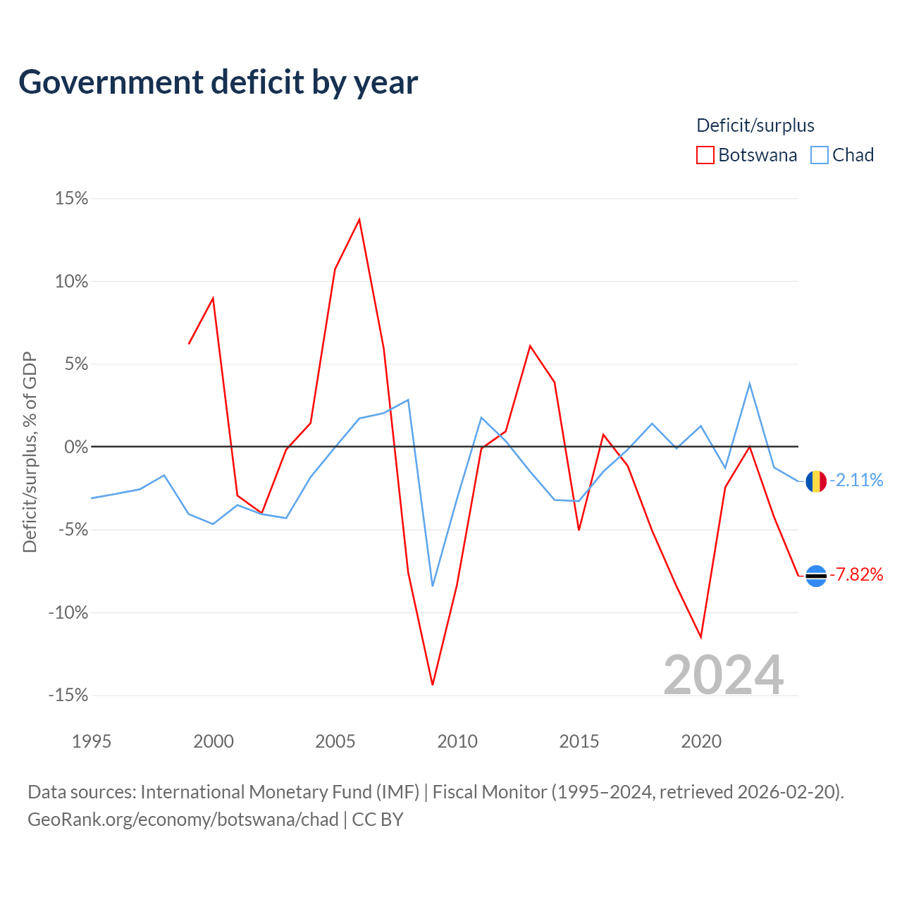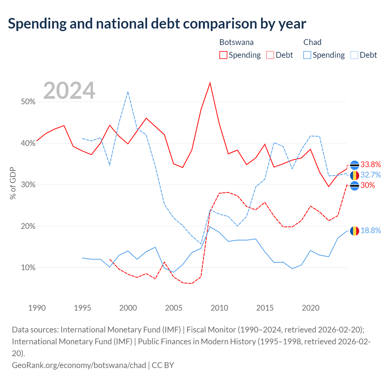 Botswana has $5.82B in government debt (30% of GDP), compared to $6.37B (32.7% of GDP) in Chad.