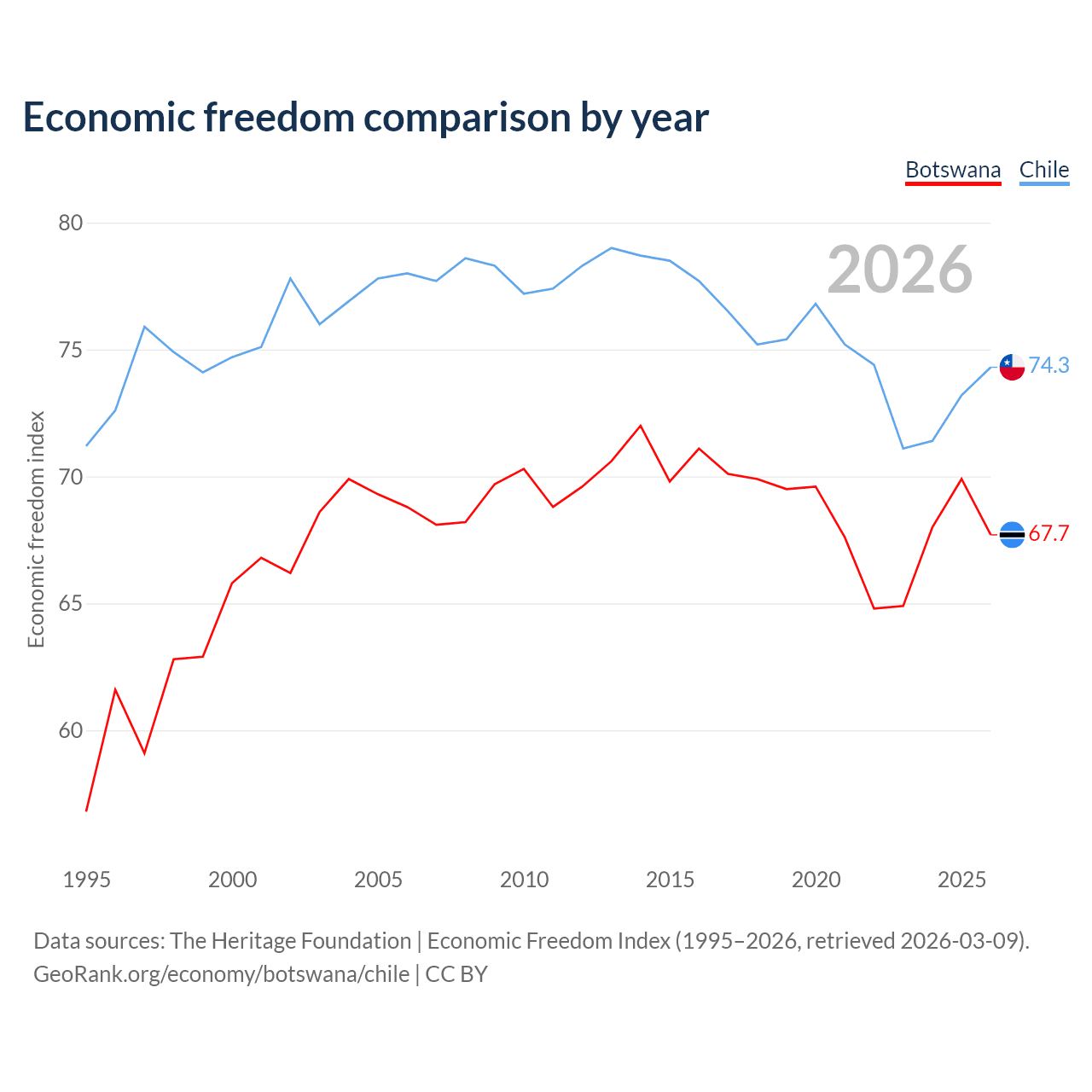 The Economic Freedom Index for Botswana is 67.7, ranking 53/197, compared to 74.3 for Chile, ranking 20/197. The chart above displays a comparison of annual changes in economic freedom indexes.