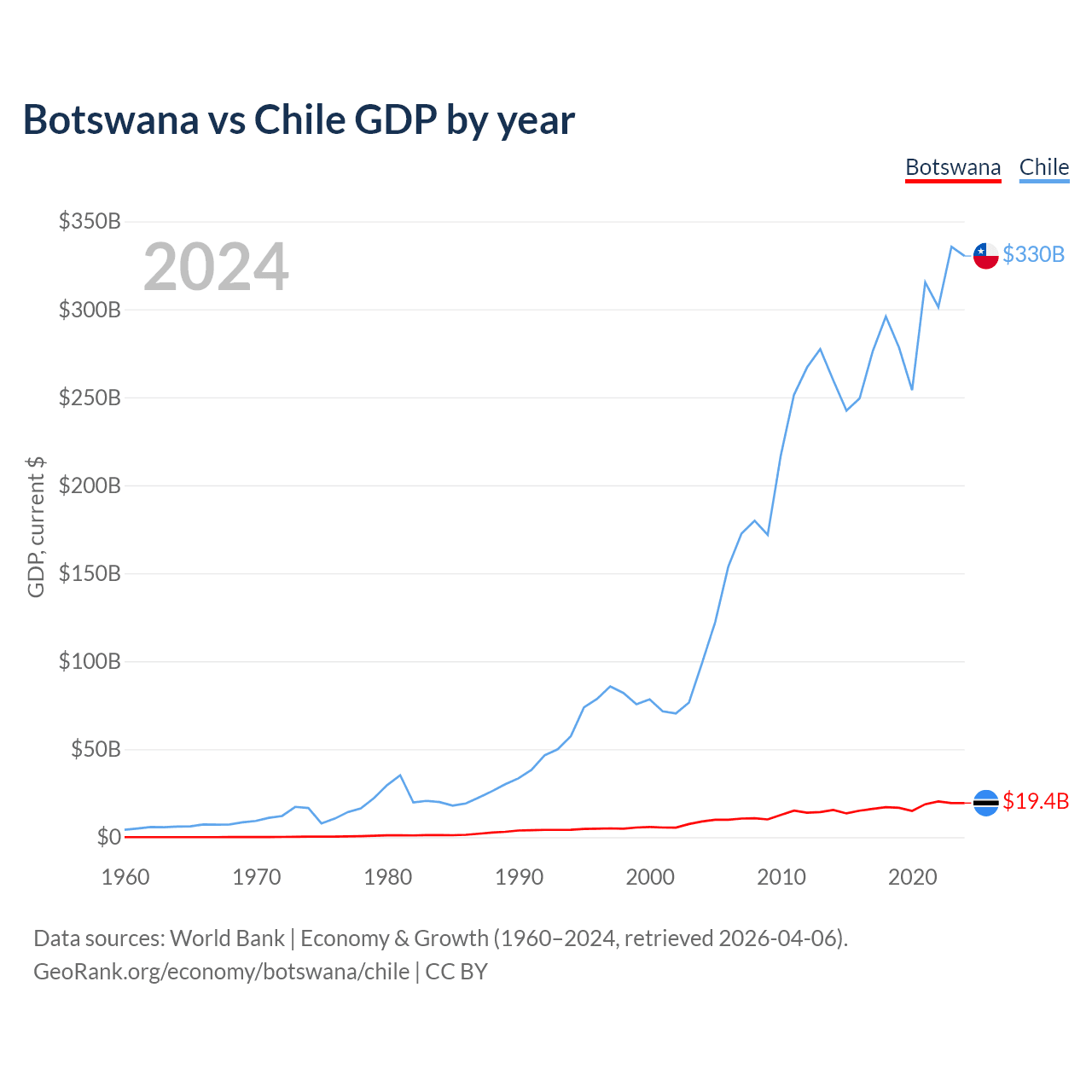 Botswana has a GDP of $19.4B compared to $330B for Chile, ranking 133/197 and 45/197 by economy size, respectively.