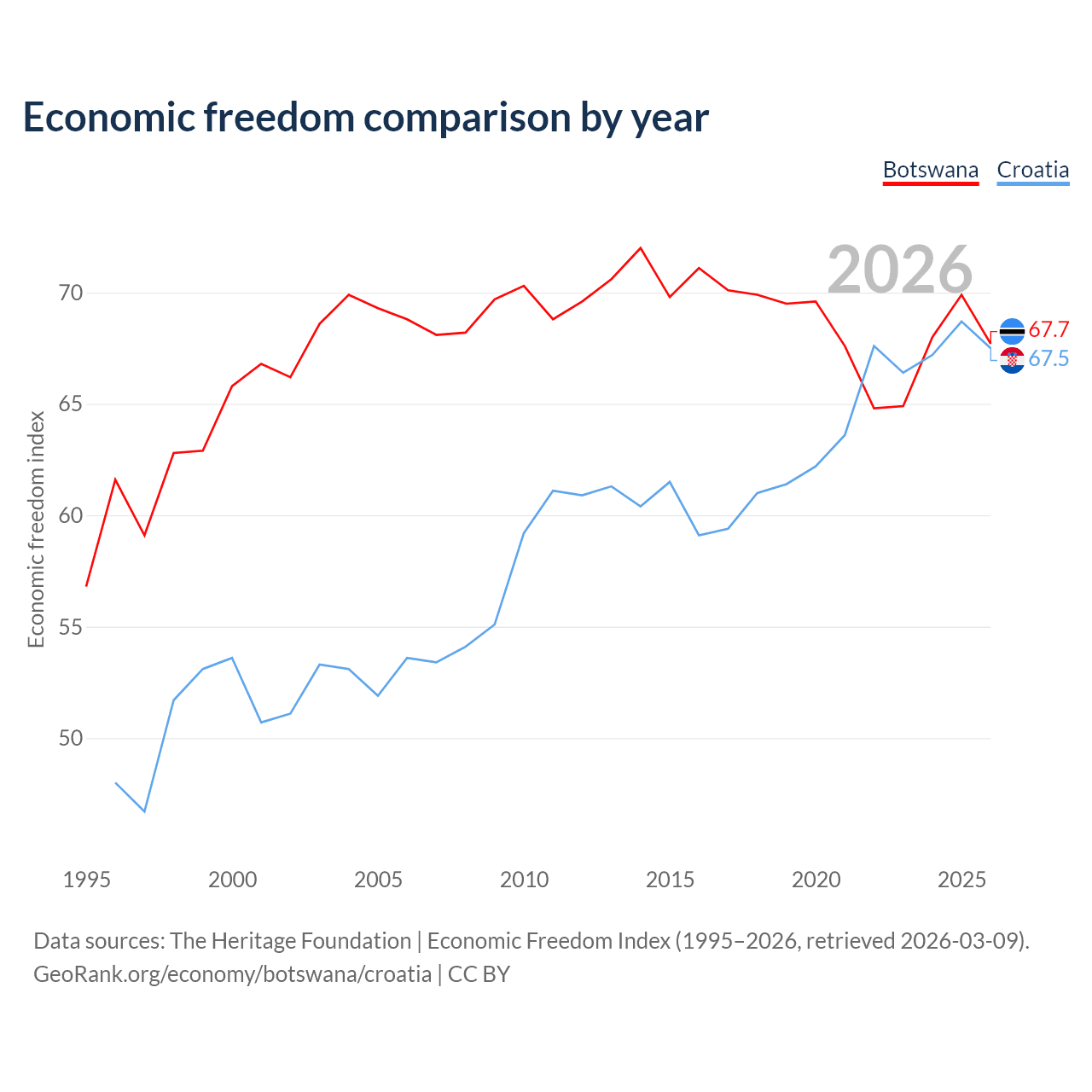 The Economic Freedom Index for Botswana is 67.7, ranking 53/197, compared to 67.5 for Croatia, ranking 56/197. The chart above displays a comparison of annual changes in economic freedom indexes.