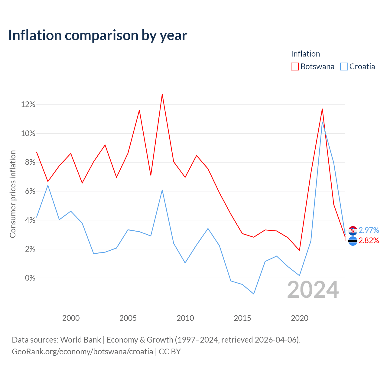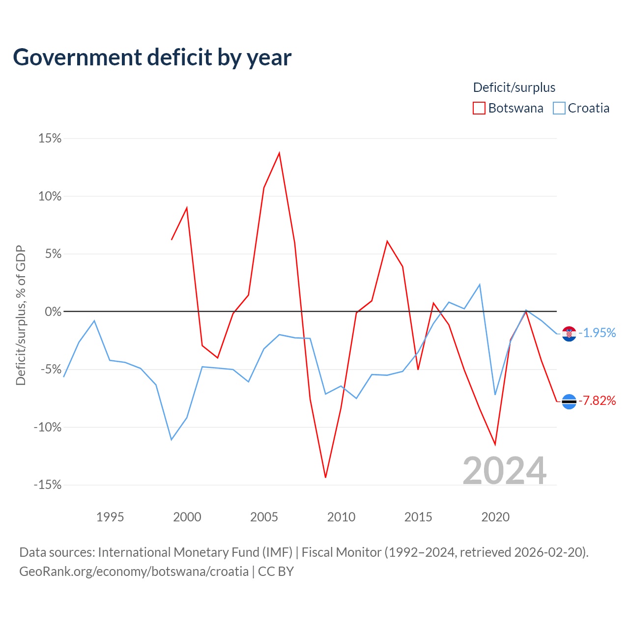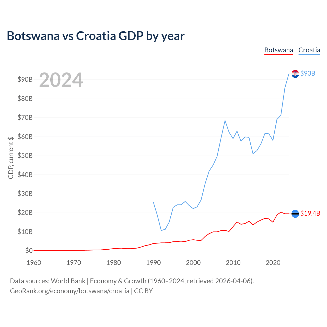 Botswana has a GDP of $19.4B compared to $93B for Croatia, ranking 133/197 and 75/197 by economy size, respectively.