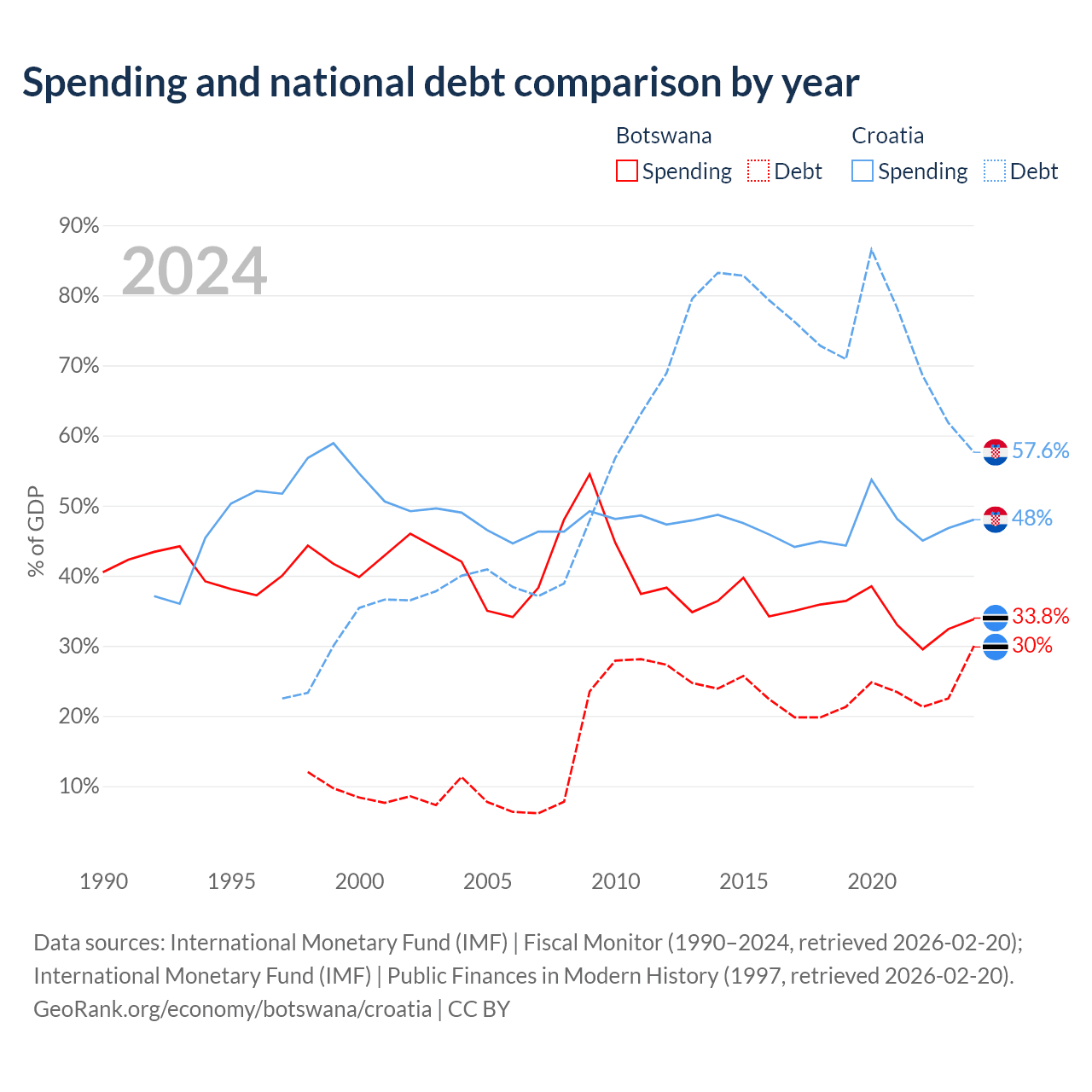 Botswana has $5.82B in government debt (30% of GDP), compared to $53.5B (57.6% of GDP) in Croatia.