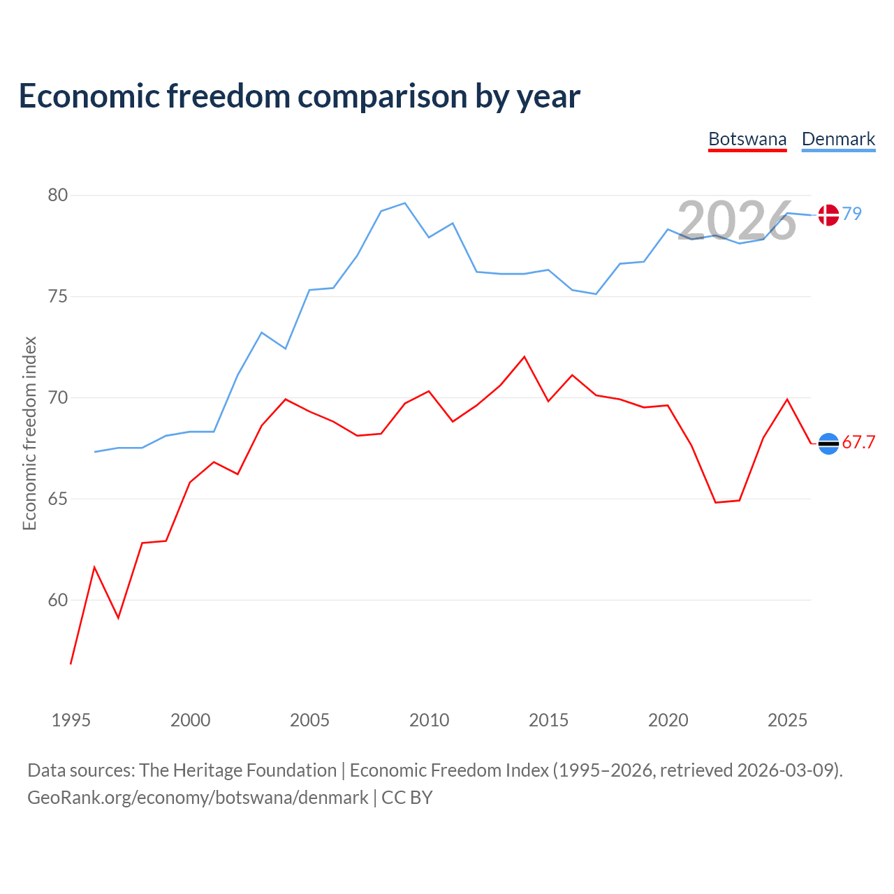 The Economic Freedom Index for Botswana is 67.7, ranking 53/197, compared to 79 for Denmark, ranking 8/197. The chart above displays a comparison of annual changes in economic freedom indexes.