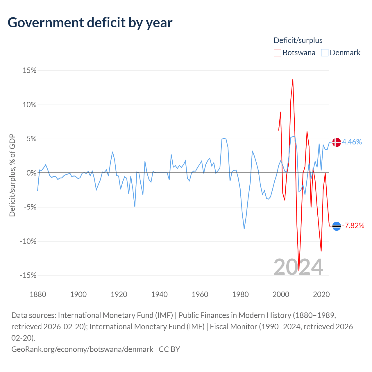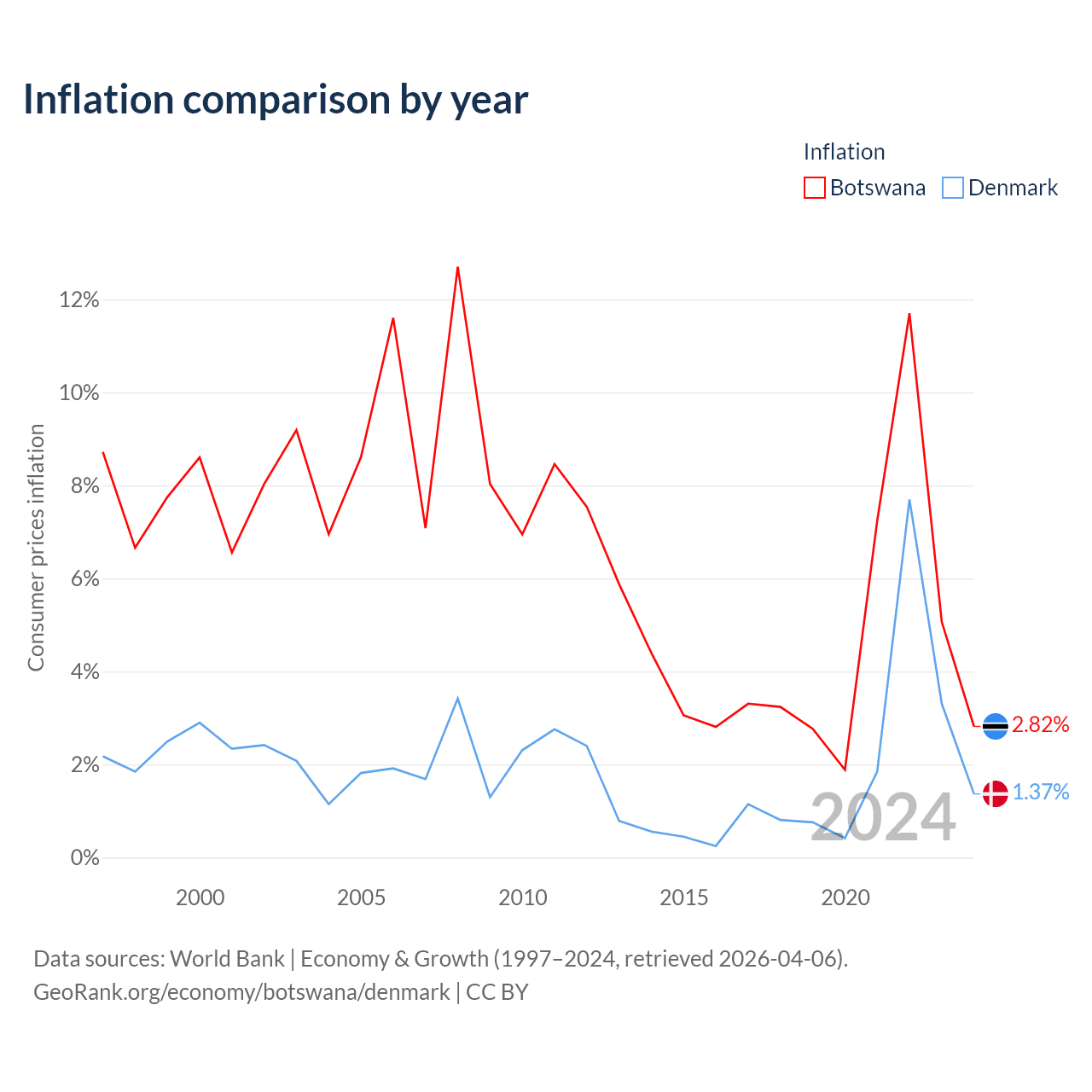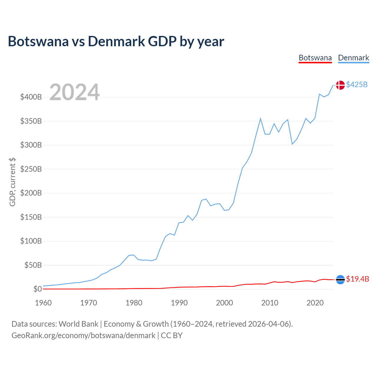 Botswana has a GDP of $19.4B compared to $425B for Denmark, ranking 133/197 and 37/197 by economy size, respectively.