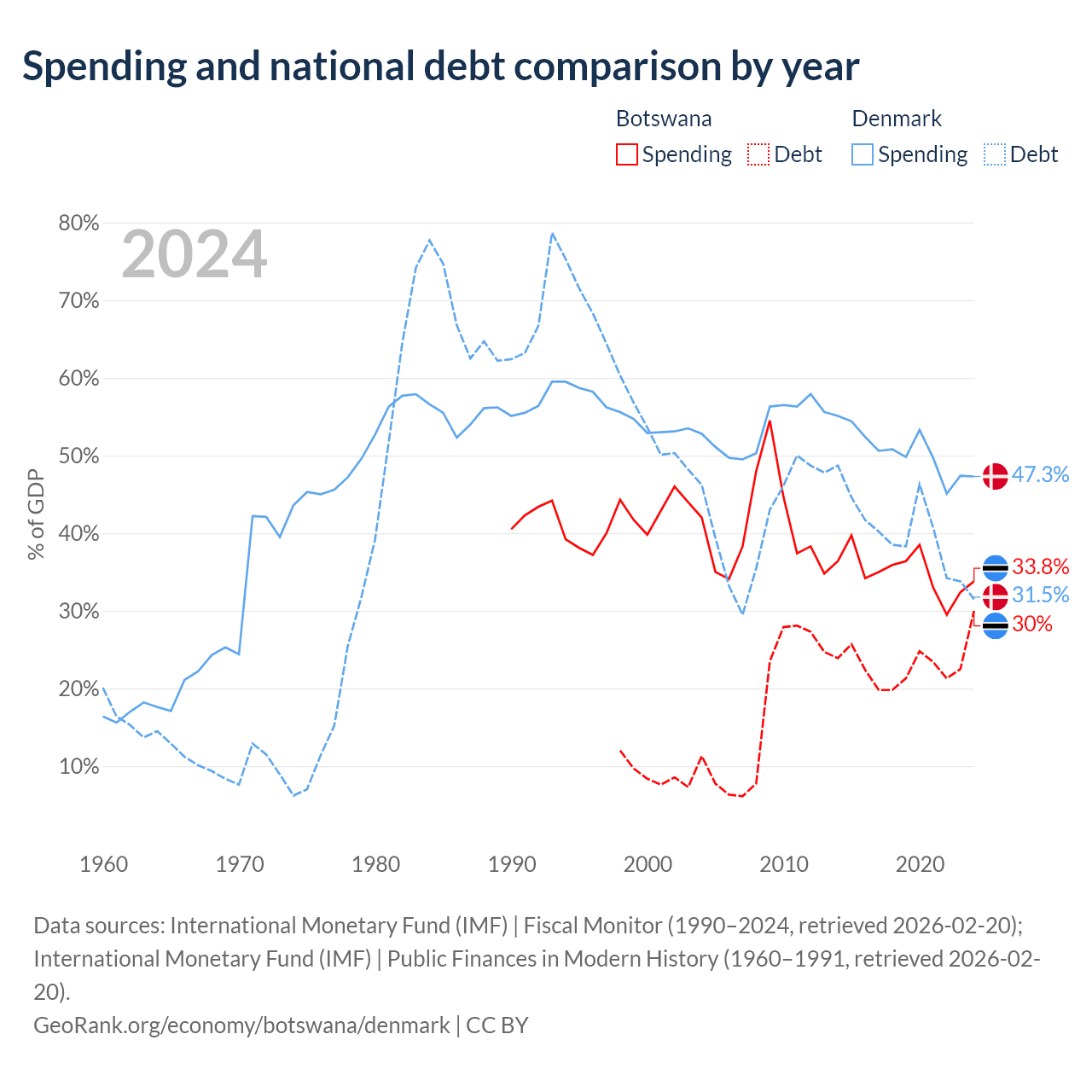 Botswana has $5.82B in government debt (30% of GDP), compared to $134B (31.5% of GDP) in Denmark.