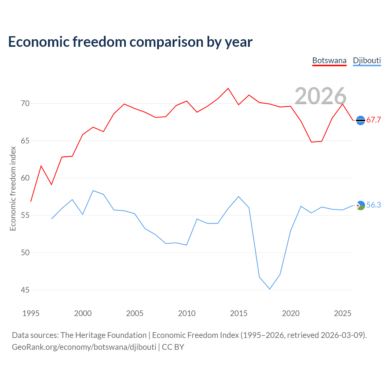 The Economic Freedom Index for Botswana is 67.7, ranking 53/197, compared to 56.3 for Djibouti, ranking 122/197. The chart above displays a comparison of annual changes in economic freedom indexes.
