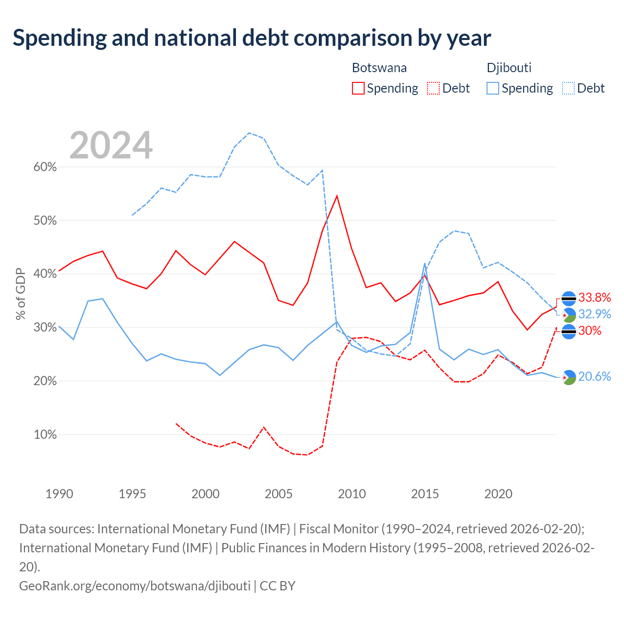 Botswana has $5.82B in government debt (30% of GDP), compared to $1.36B (32.9% of GDP) in Djibouti.