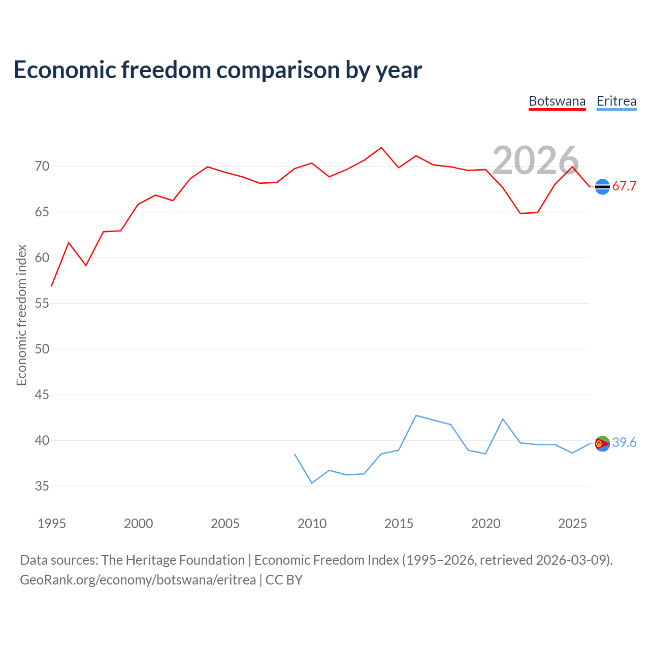 The Economic Freedom Index for Botswana is 67.7, ranking 53/197, compared to 39.6 for Eritrea, ranking 188/197. The chart above displays a comparison of annual changes in economic freedom indexes.