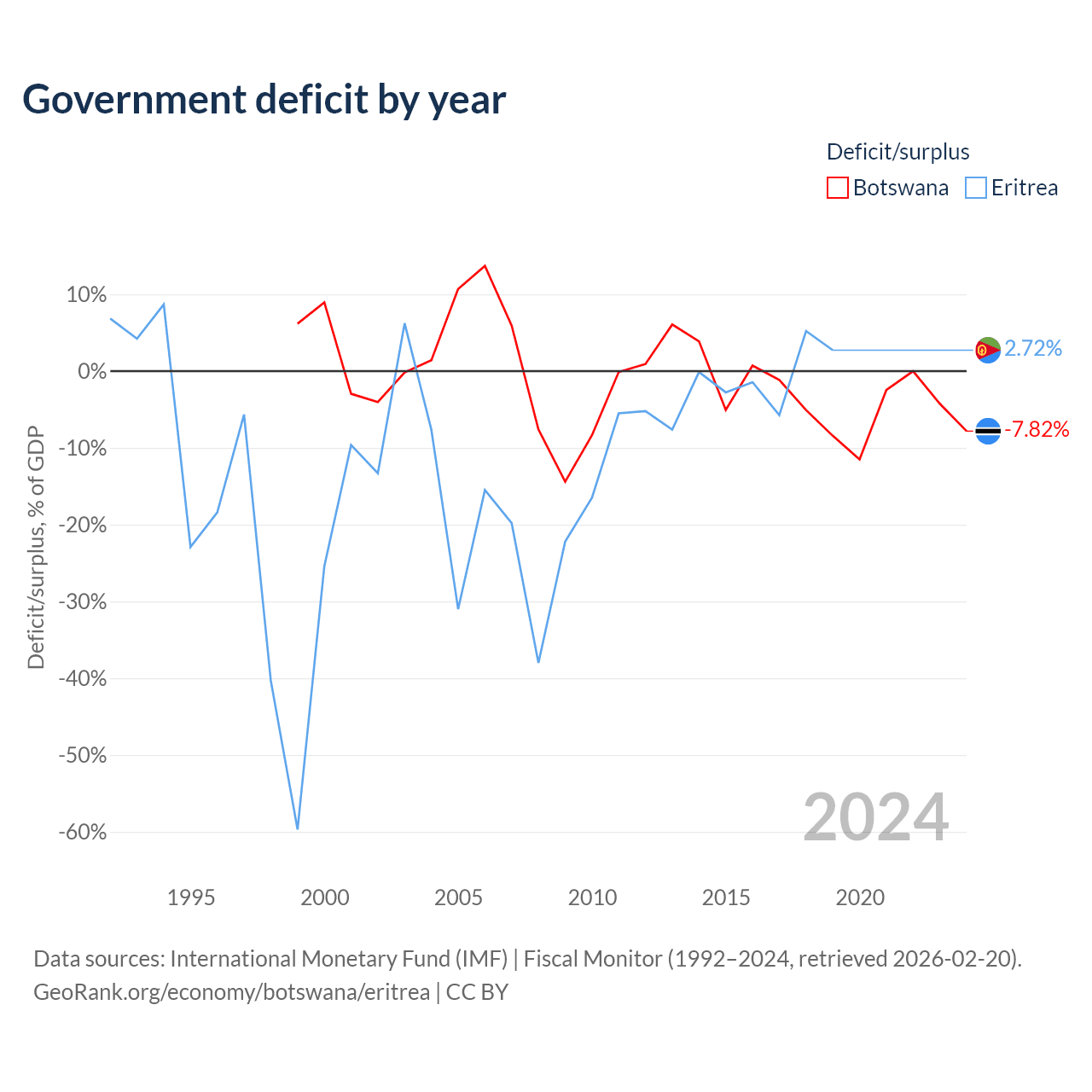 Botswana has a GDP of $19.4B compared to $2.07B for Eritrea, ranking 133/197 and 179/197 by economy size, respectively.