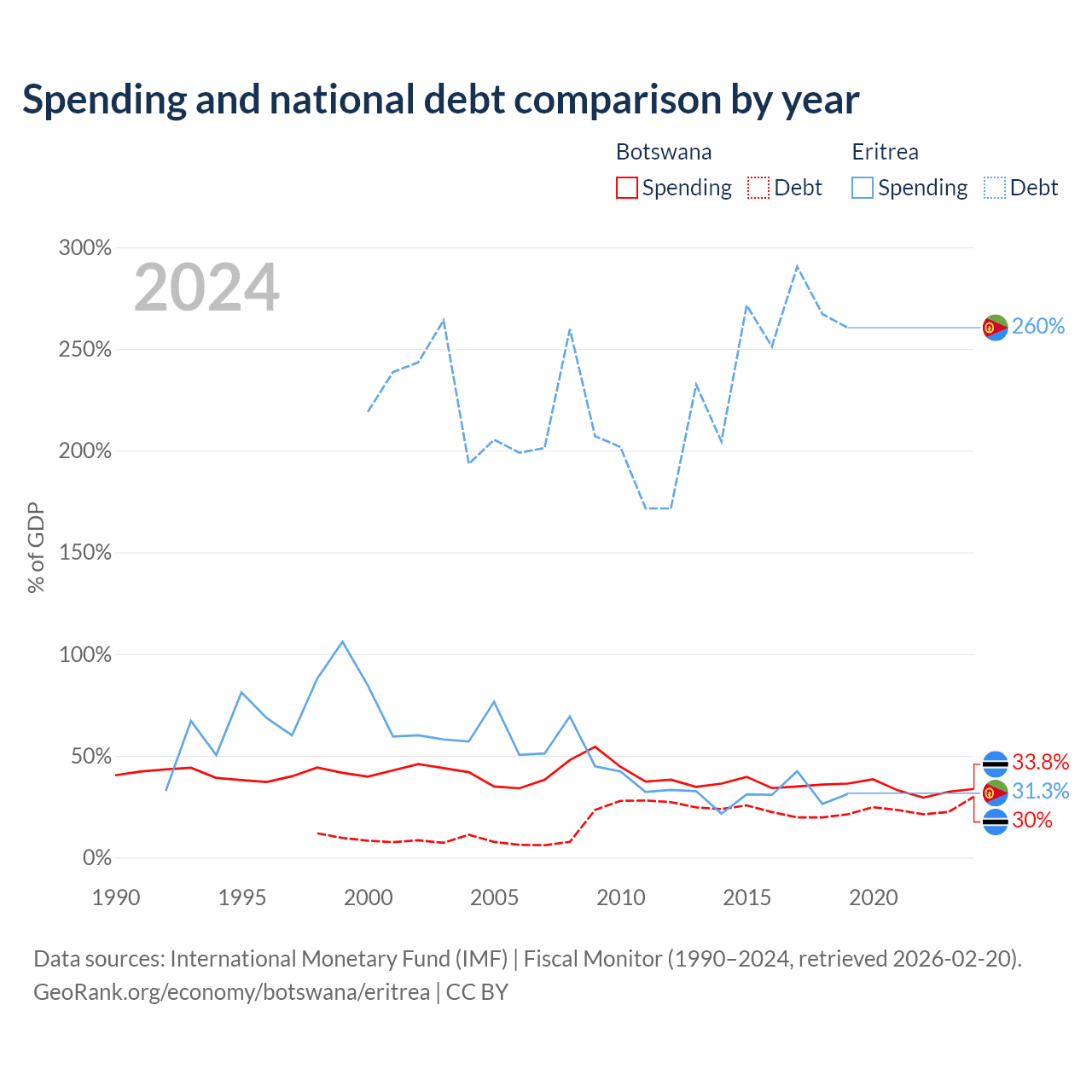 Botswana has $5.82B in government debt (30% of GDP), compared to $3.54B (260.4% of GDP) in Eritrea.