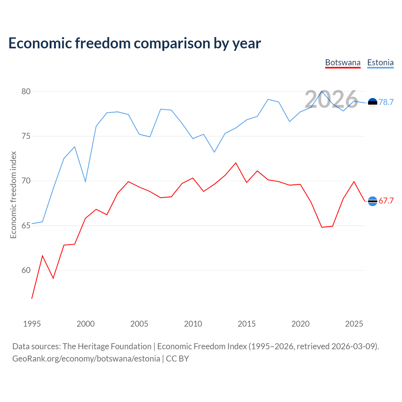 The Economic Freedom Index for Botswana is 67.7, ranking 53/197, compared to 78.7 for Estonia, ranking 10/197. The chart above displays a comparison of annual changes in economic freedom indexes.