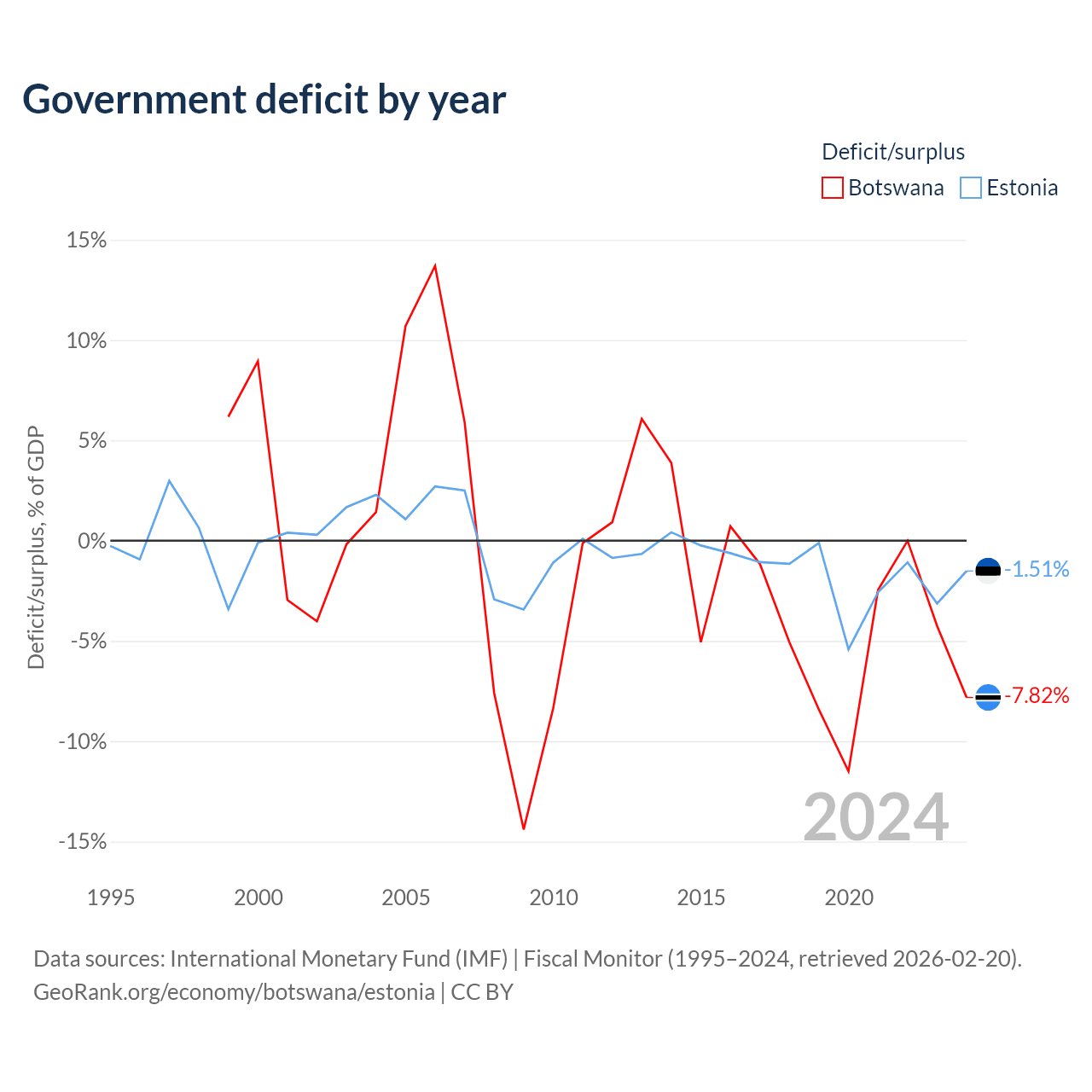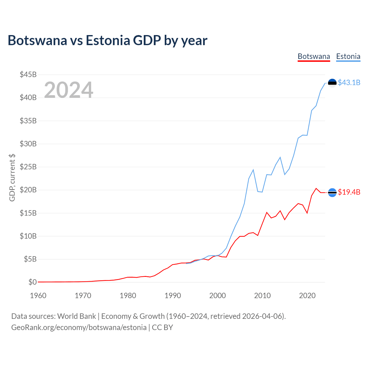 Botswana has a GDP of $19.4B compared to $43.1B for Estonia, ranking 133/197 and 100/197 by economy size, respectively.