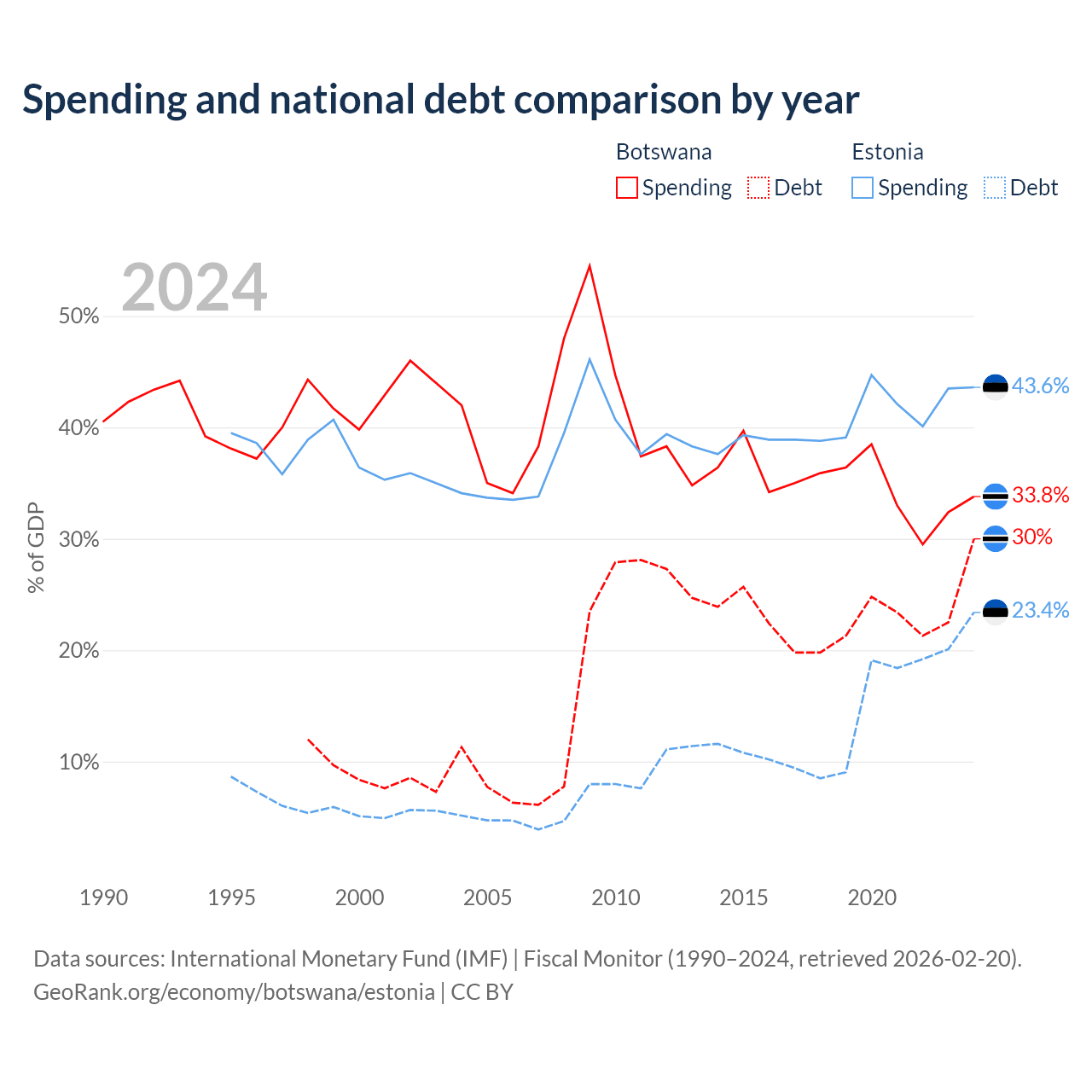 Botswana has $5.82B in government debt (30% of GDP), compared to $10.1B (23.4% of GDP) in Estonia.