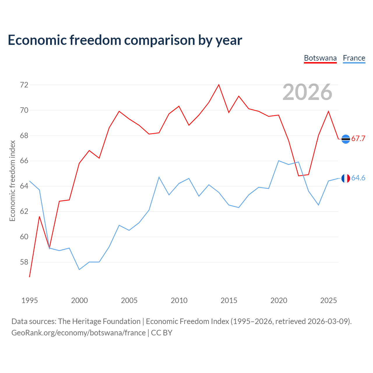 The Economic Freedom Index for Botswana is 67.7, ranking 53/197, compared to 64.6 for France, ranking 72/197. The chart above displays a comparison of annual changes in economic freedom indexes.