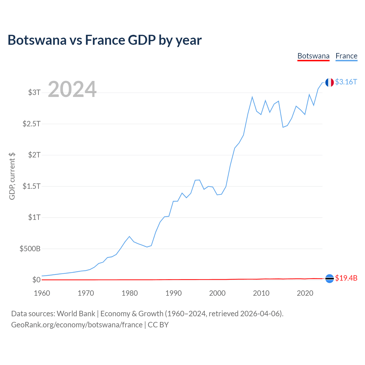 Botswana has a GDP of $19.4B compared to $3.16T for France, ranking 133/197 and 7/197 by economy size, respectively.