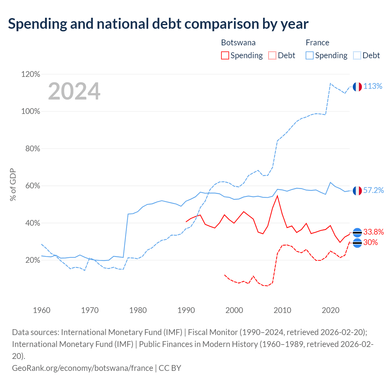 Botswana has $5.82B in government debt (30% of GDP), compared to $3.58T (113.1% of GDP) in France.