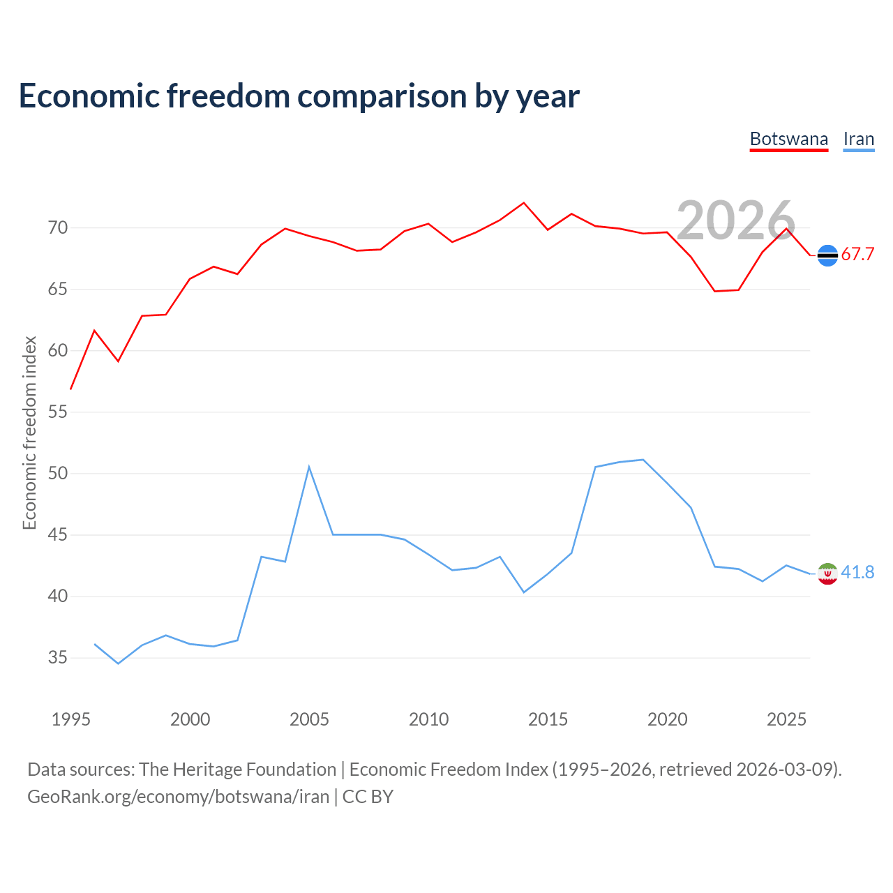 The Economic Freedom Index for Botswana is 67.7, ranking 53/197, compared to 41.8 for Iran, ranking 185/197. The chart above displays a comparison of annual changes in economic freedom indexes.