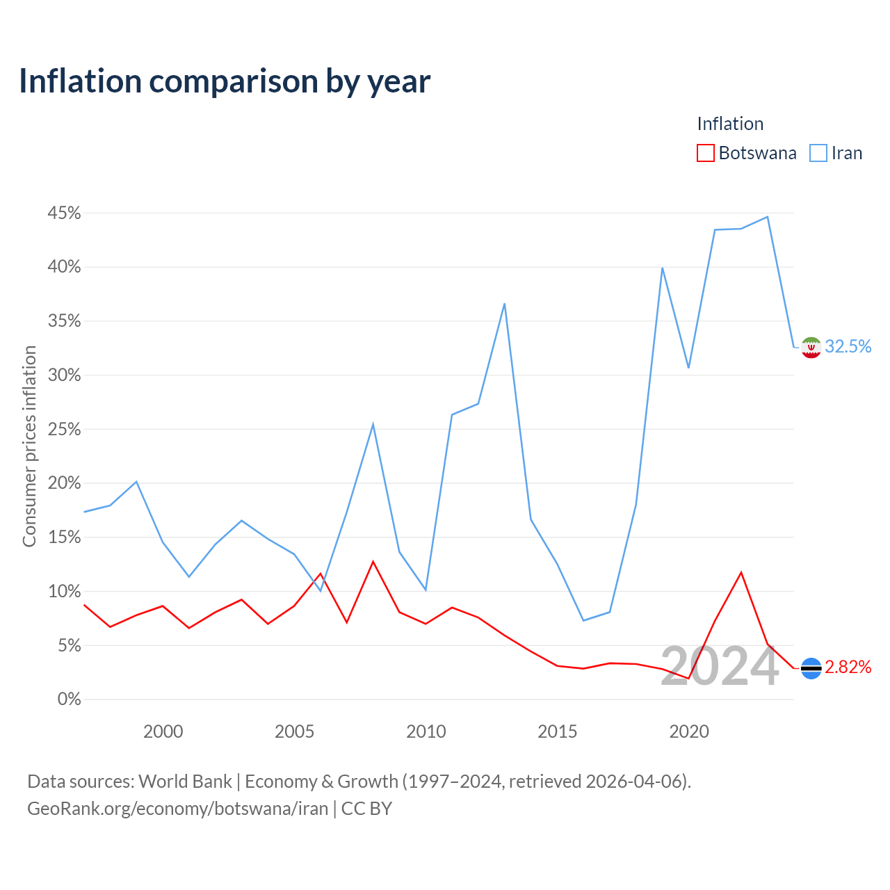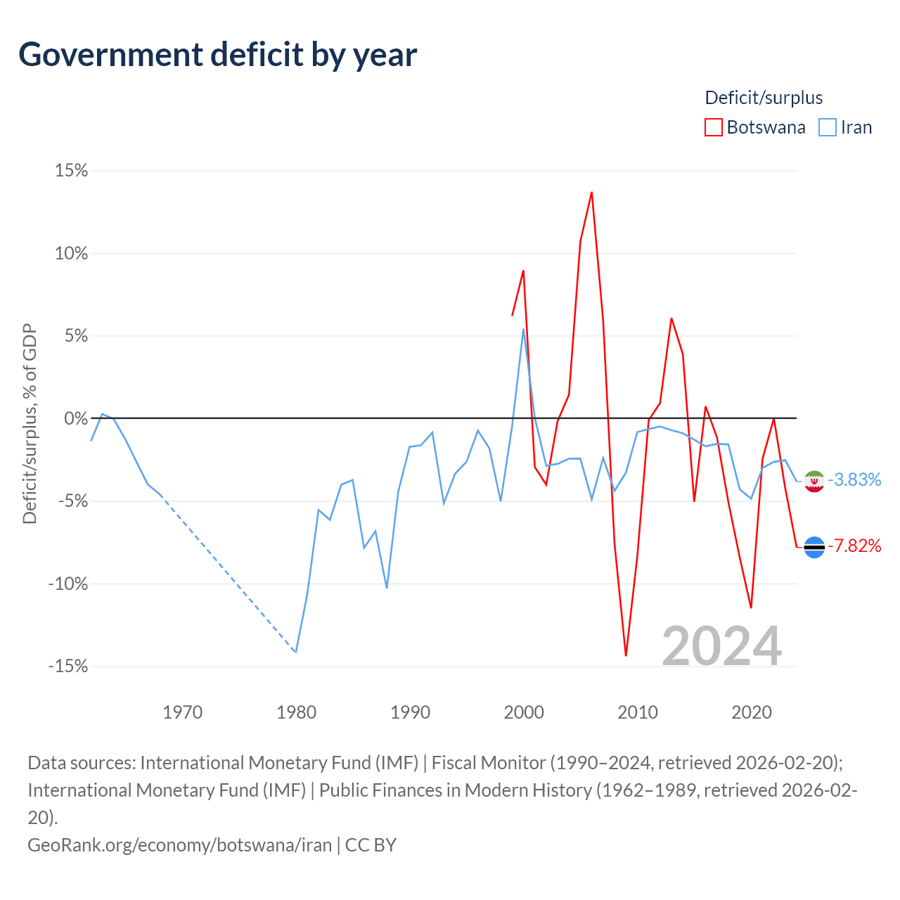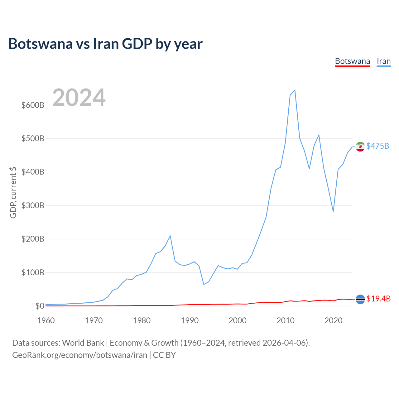 Botswana has a GDP of $19.4B compared to $475B for Iran, ranking 133/197 and 34/197 by economy size, respectively.