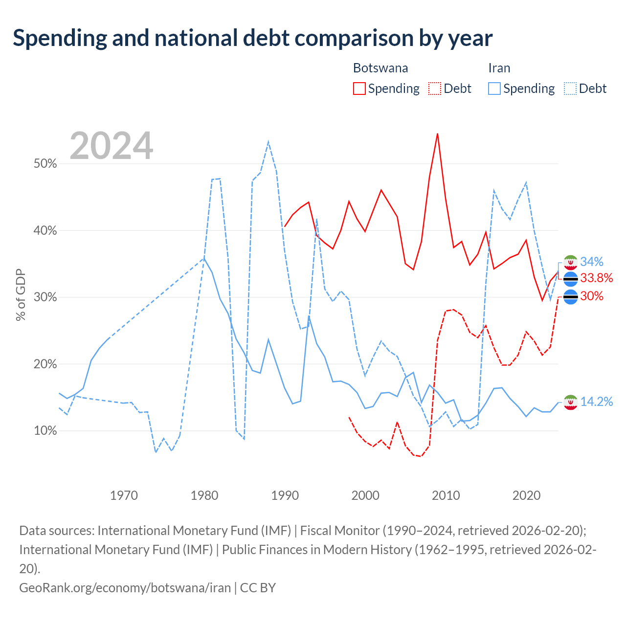 Botswana has $5.82B in government debt (30% of GDP), compared to $162B (34% of GDP) in Iran.