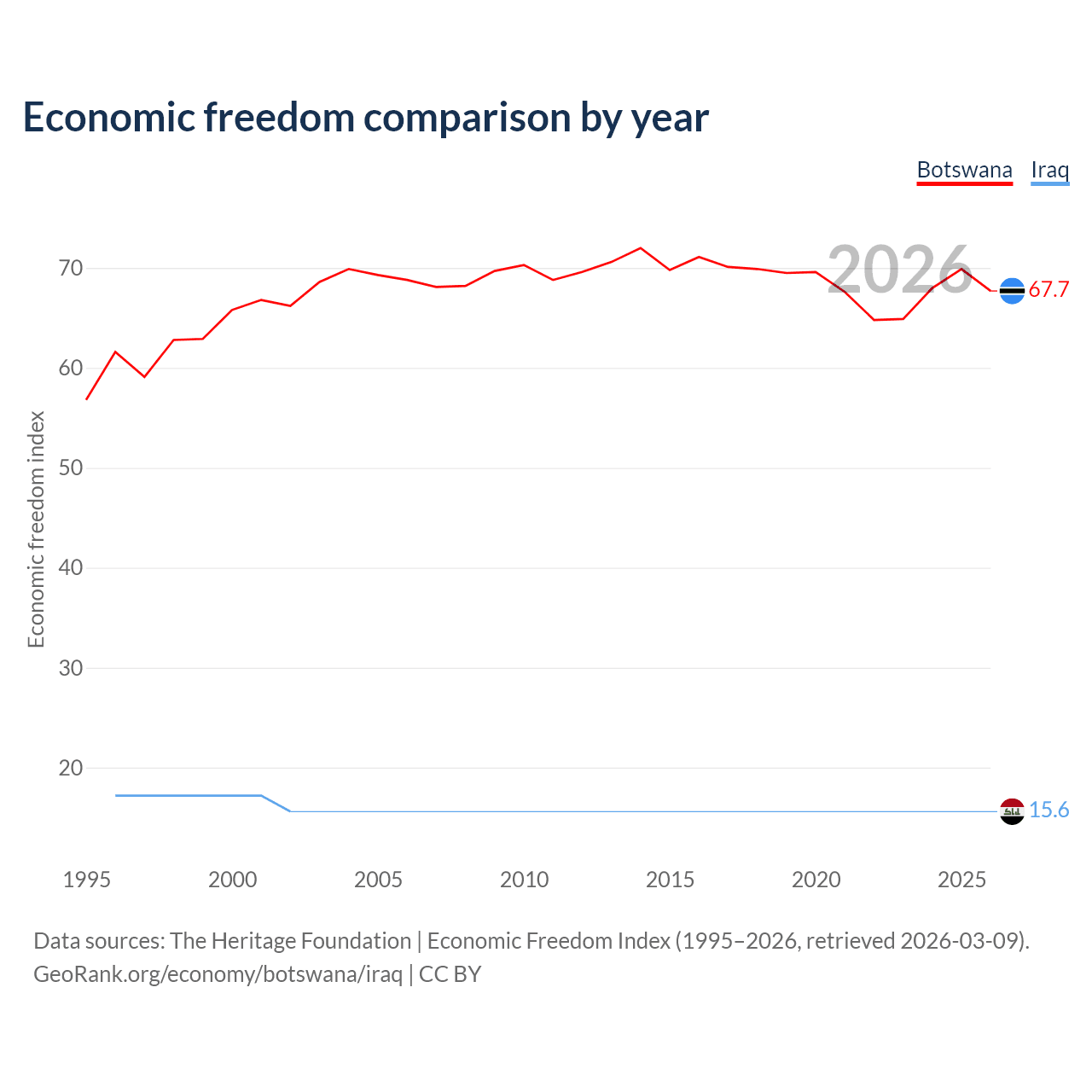 The Economic Freedom Index for Botswana is 67.7, ranking 53/197, compared to 15.6 for Iraq, ranking 196/197. The chart above displays a comparison of annual changes in economic freedom indexes.