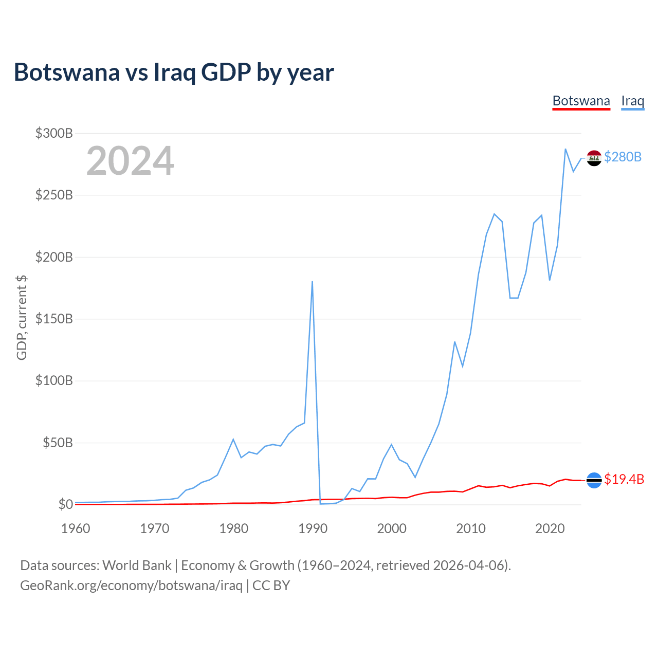 Botswana has a GDP of $19.4B compared to $280B for Iraq, ranking 133/197 and 50/197 by economy size, respectively.