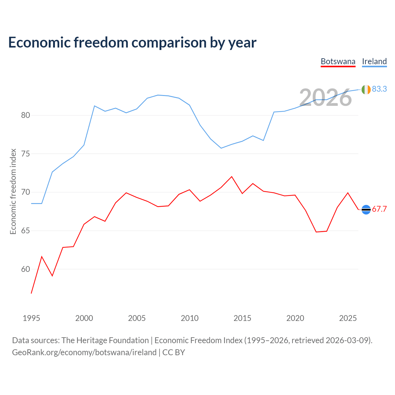 The Economic Freedom Index for Botswana is 67.7, ranking 53/197, compared to 83.3 for Ireland, ranking 3/197. The chart above displays a comparison of annual changes in economic freedom indexes.
