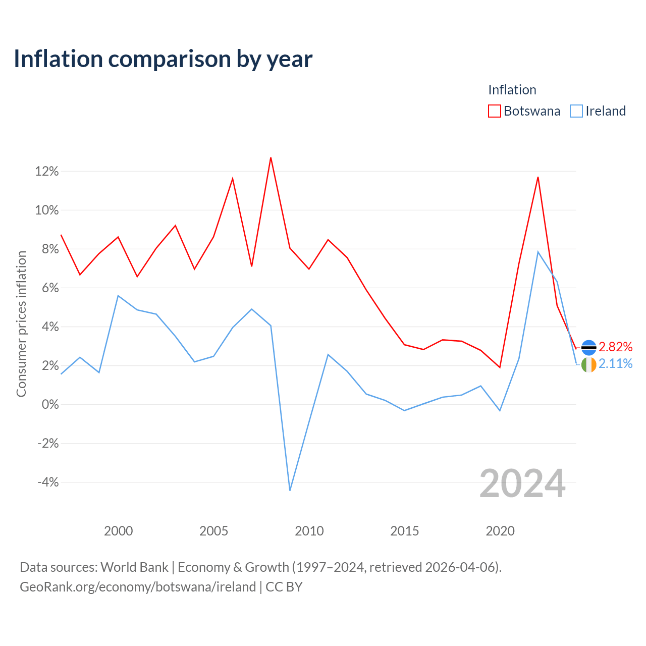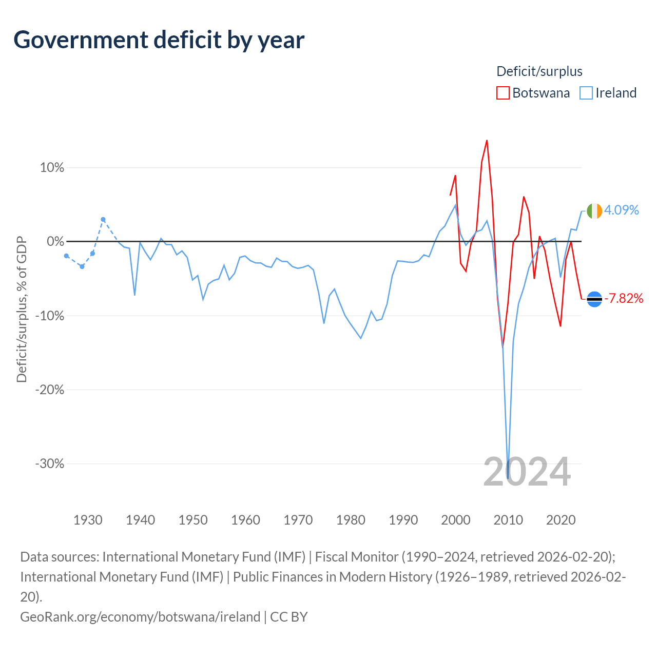 Botswana has a GDP of $19.4B compared to $609B for Ireland, ranking 133/197 and 25/197 by economy size, respectively.