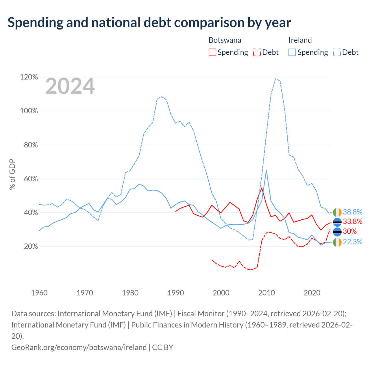 Botswana has $5.82B in government debt (30% of GDP), compared to $236B (38.8% of GDP) in Ireland.