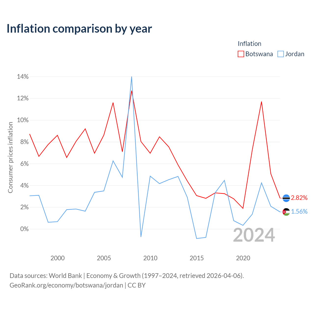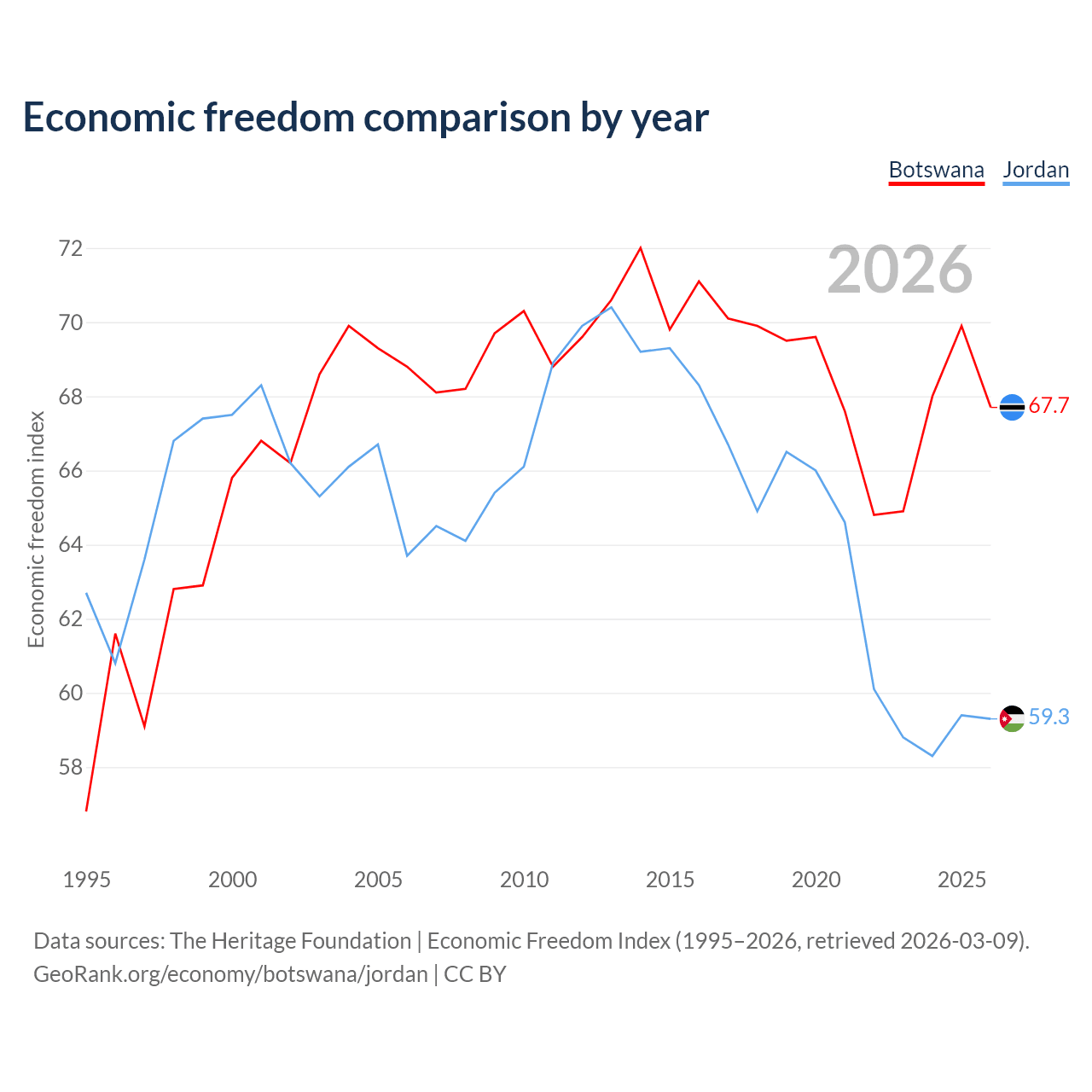 The Economic Freedom Index for Botswana is 67.7, ranking 53/197, compared to 59.3 for Jordan, ranking 104/197. The chart above displays a comparison of annual changes in economic freedom indexes.