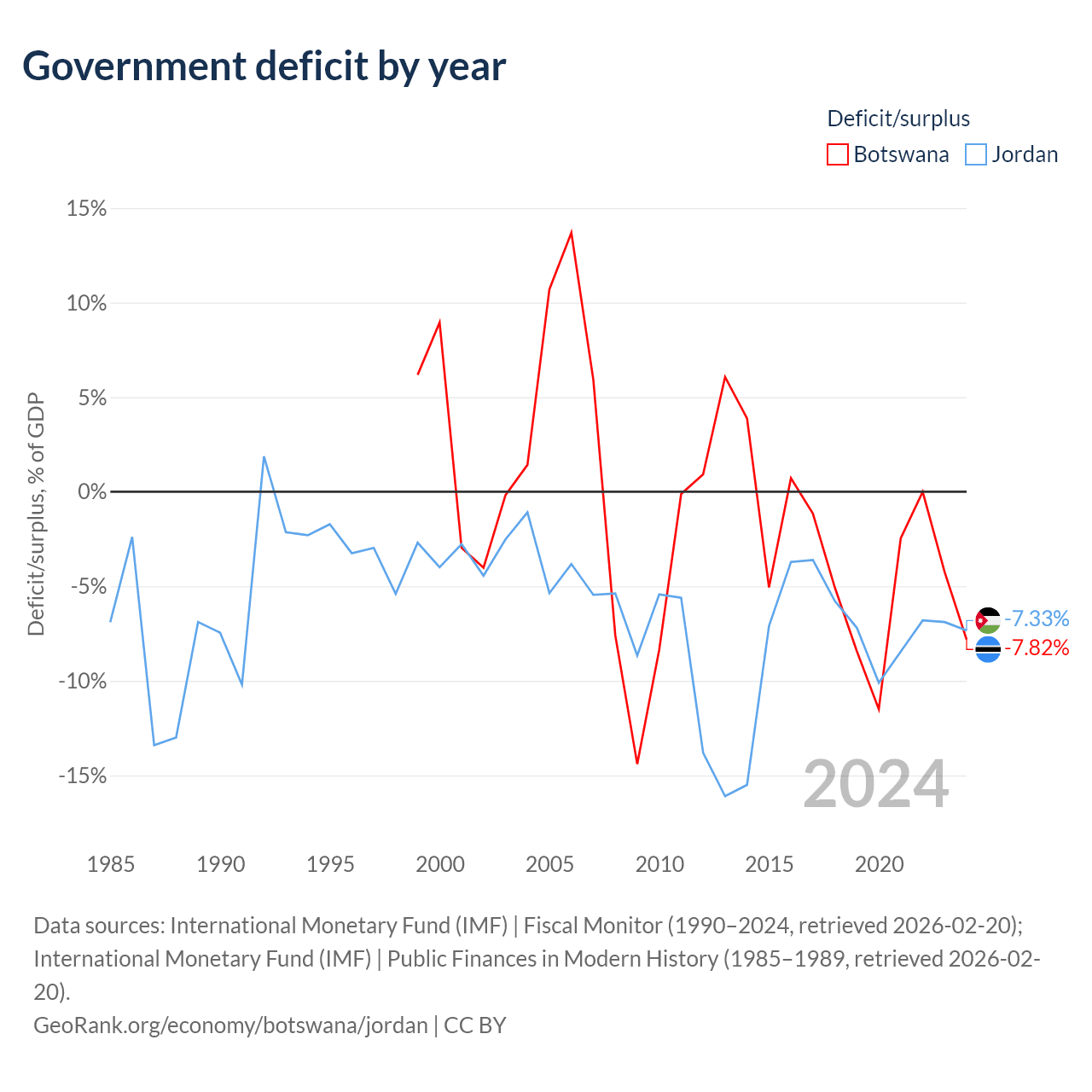 Botswana has a GDP of $19.4B compared to $53.4B for Jordan, ranking 133/197 and 90/197 by economy size, respectively.