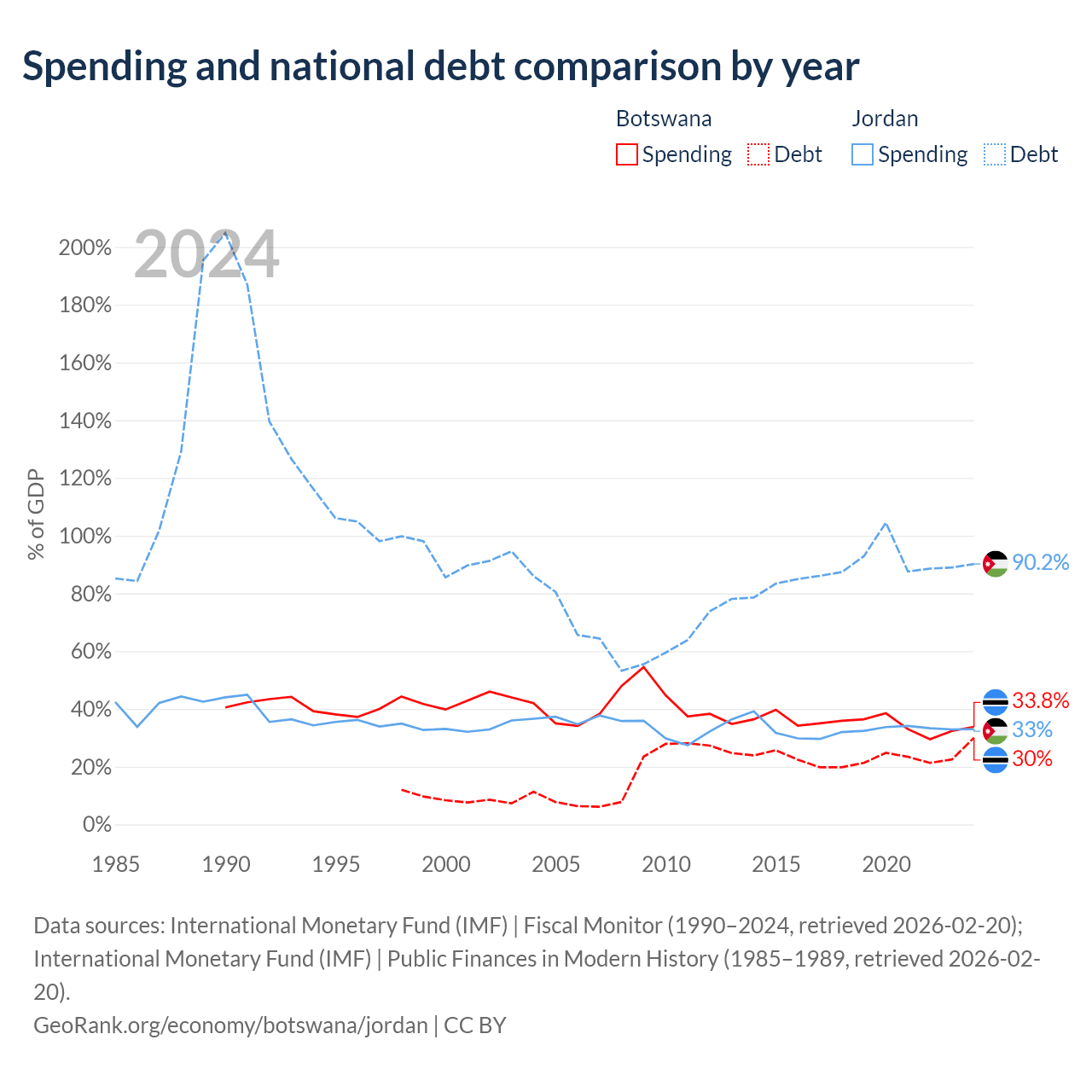 Botswana has $5.82B in government debt (30% of GDP), compared to $48.1B (90.2% of GDP) in Jordan.