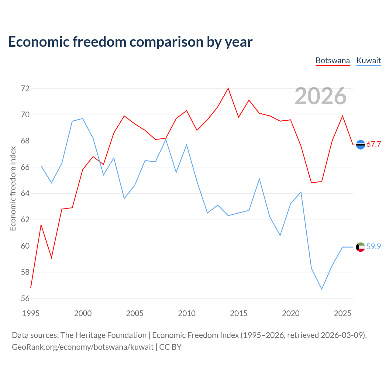 The Economic Freedom Index for Botswana is 67.7, ranking 53/197, compared to 59.9 for Kuwait, ranking 100/197. The chart above displays a comparison of annual changes in economic freedom indexes.