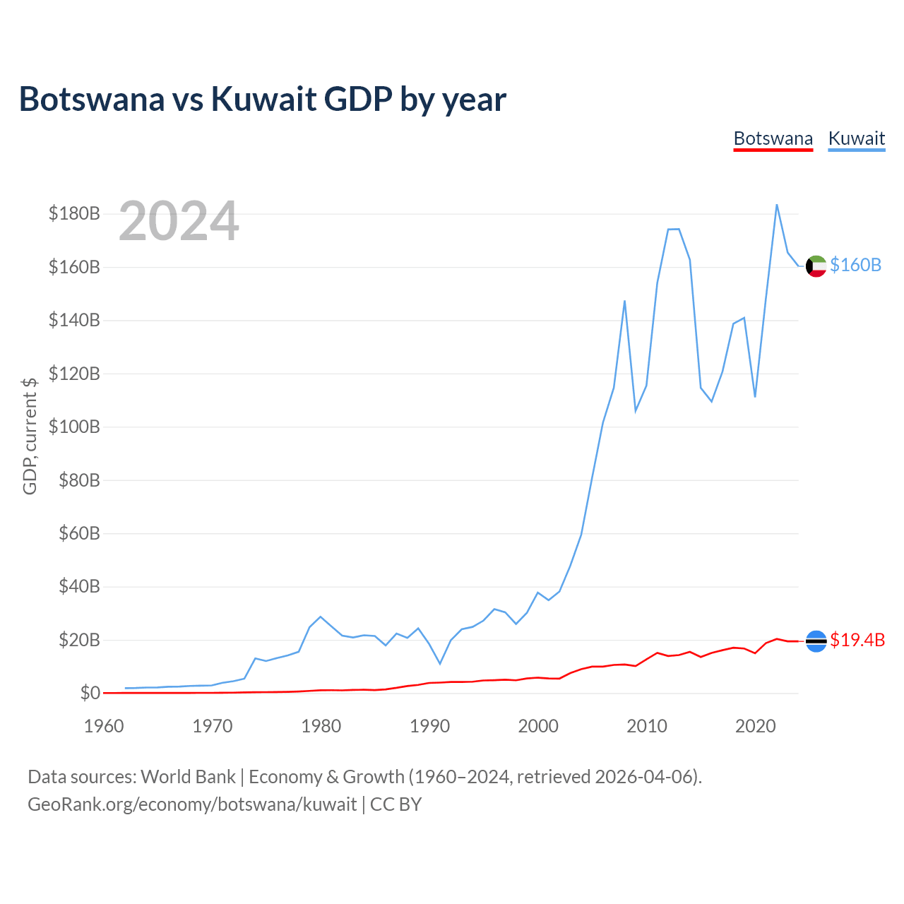 Botswana vs Kuwait GDP by year